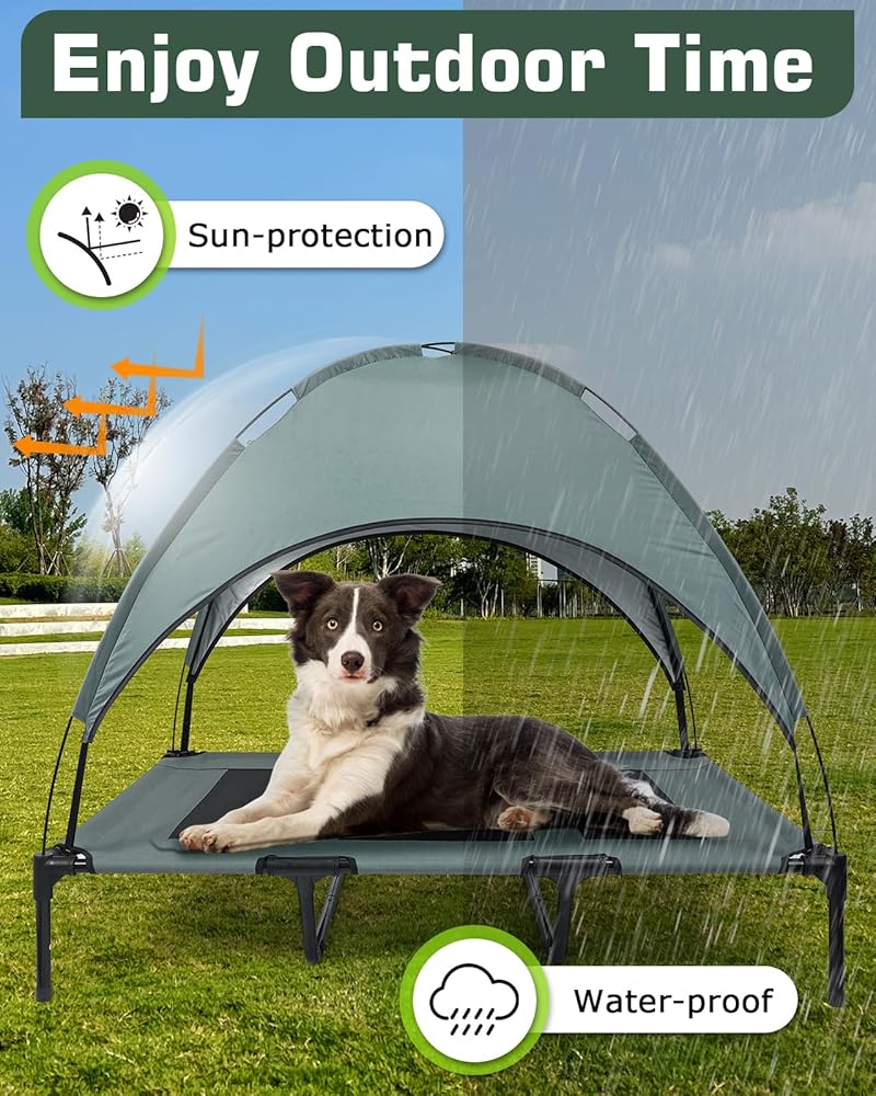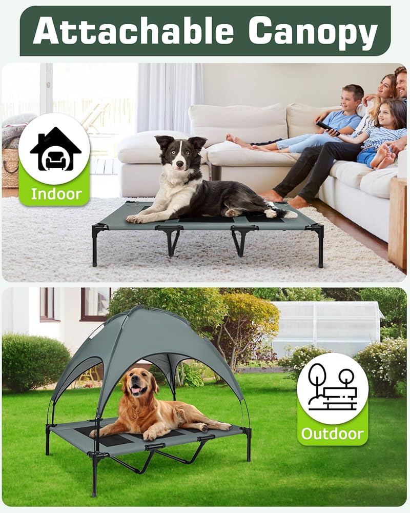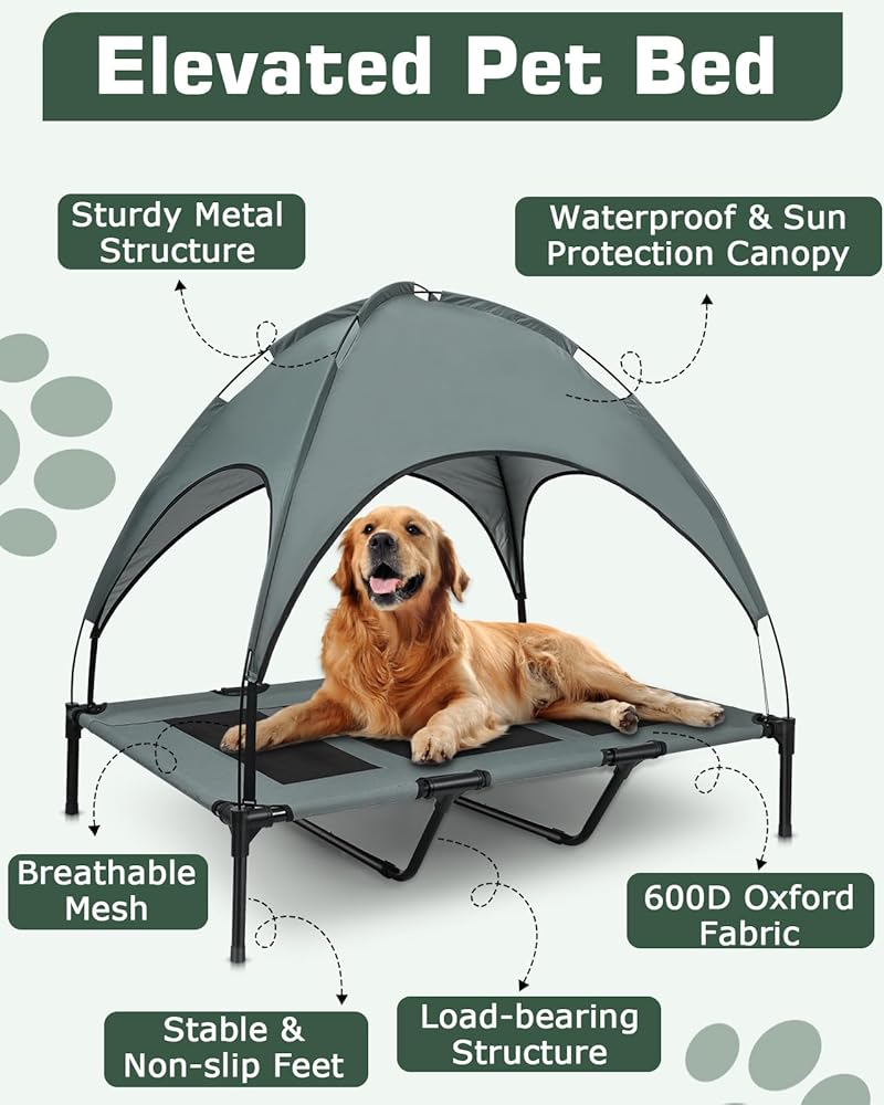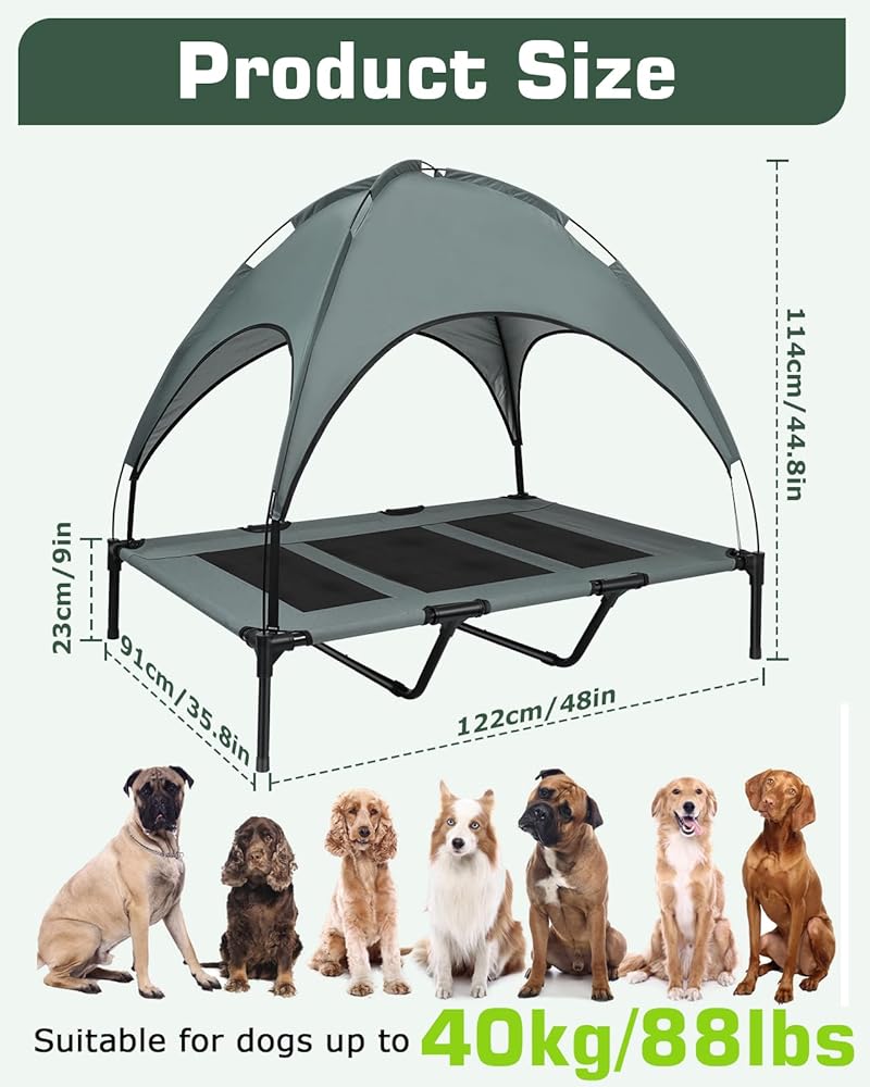 Elevated Outdoor Dog Bed with Canopy, with Anti-Slip Feet, Breathable Mesh for Indoor & Outdoor Use, Portable Cooling Dog Bed for Dogs Up to 88LBS (XL)