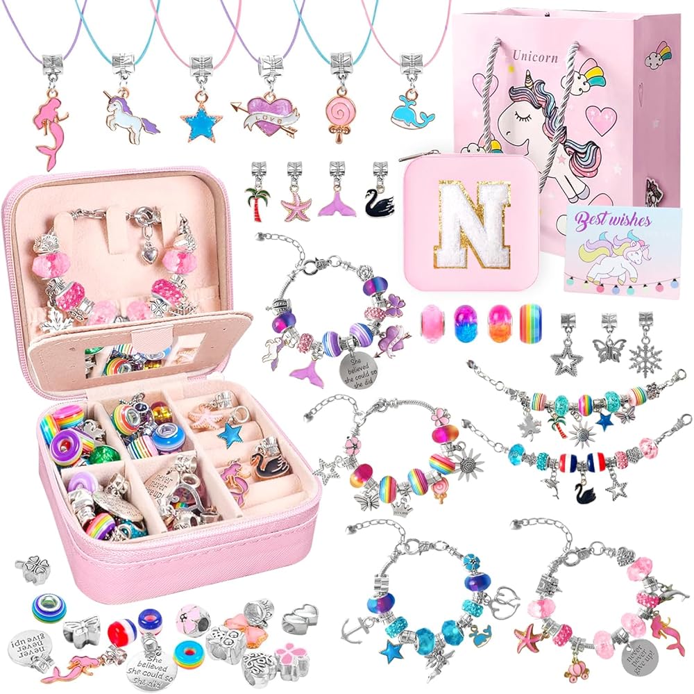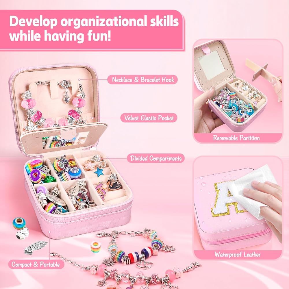 【Personalized Gift for Girls Ages 5-12】: Our Charm Bracelet Making Kit comes with a unique initial jewelry box, making it a perfect gift for teen girls. They can select their favorite charms and beads to craft unique jewelry for various occasions. Personalize it with her monogram for an extra special touch. Ideal as a birthday, Christmas, or Easter gift, or for any occasion, it's a perfect choice for young jewelry craft enthusiasts.