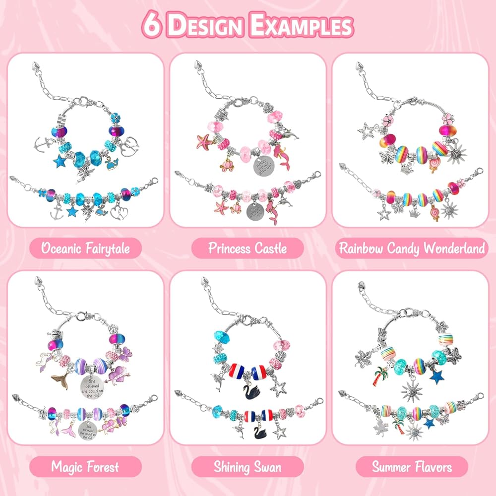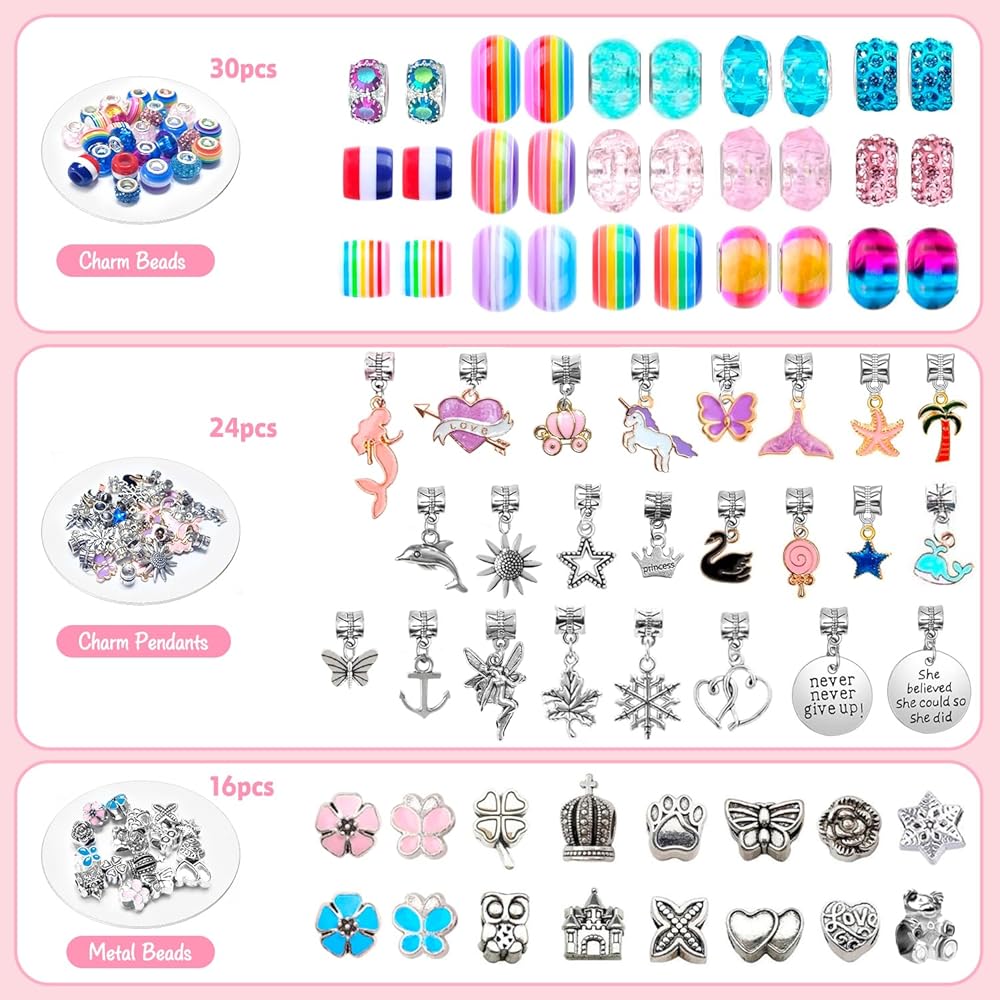 【Easy to Use - No Tools, No Mess】: Our charm bracelet kit is designed for easy use by kids aged 5 and above. No tools required or adult help needed. Simply unscrew the end cap, thread a bead or pendant of choice, and tighten the end cap. Kids can change bracelet charms, beads, and color combinations to create one-of-a-kind charm bracelets and necklaces. This charm bracelet kit encourages children to unleash their creativity and express their individuality.