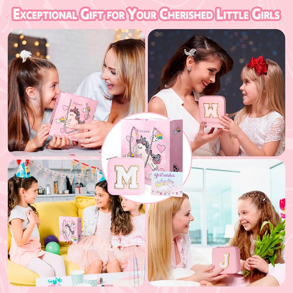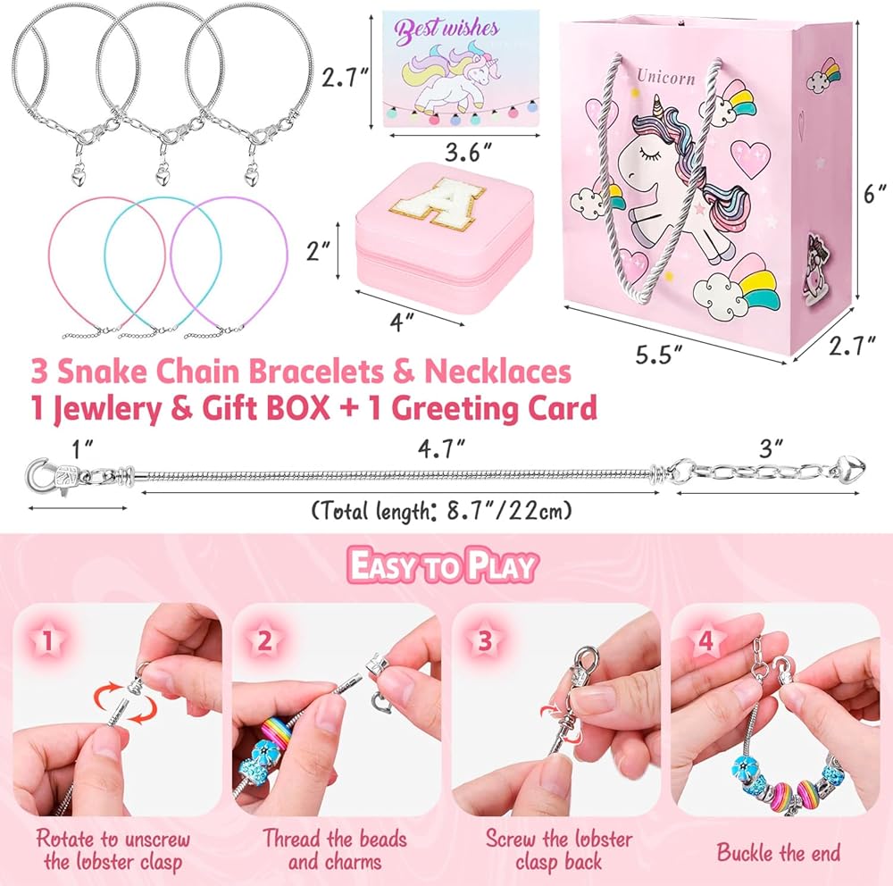 【Great Value - 77 Pieces】: Our kids jewelry making kit includes 74 diverse accessories: 24 charm pendants, 28 large hole beads, 16 metal beads, 3 snake chain bracelets, and 3 necklaces. Additionally, you'll receive a pink small jewelry box with an exquisite initial letter, a unicorn greeting card, and a gift bag (pink) for easy gifting. Everything you need is neatly packed in a gift box with a top handle.