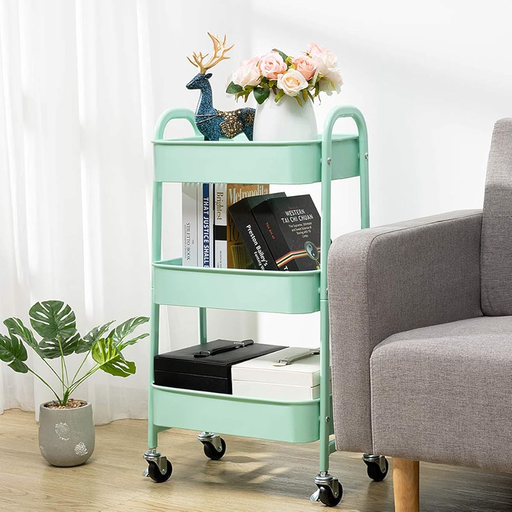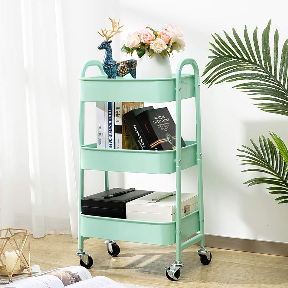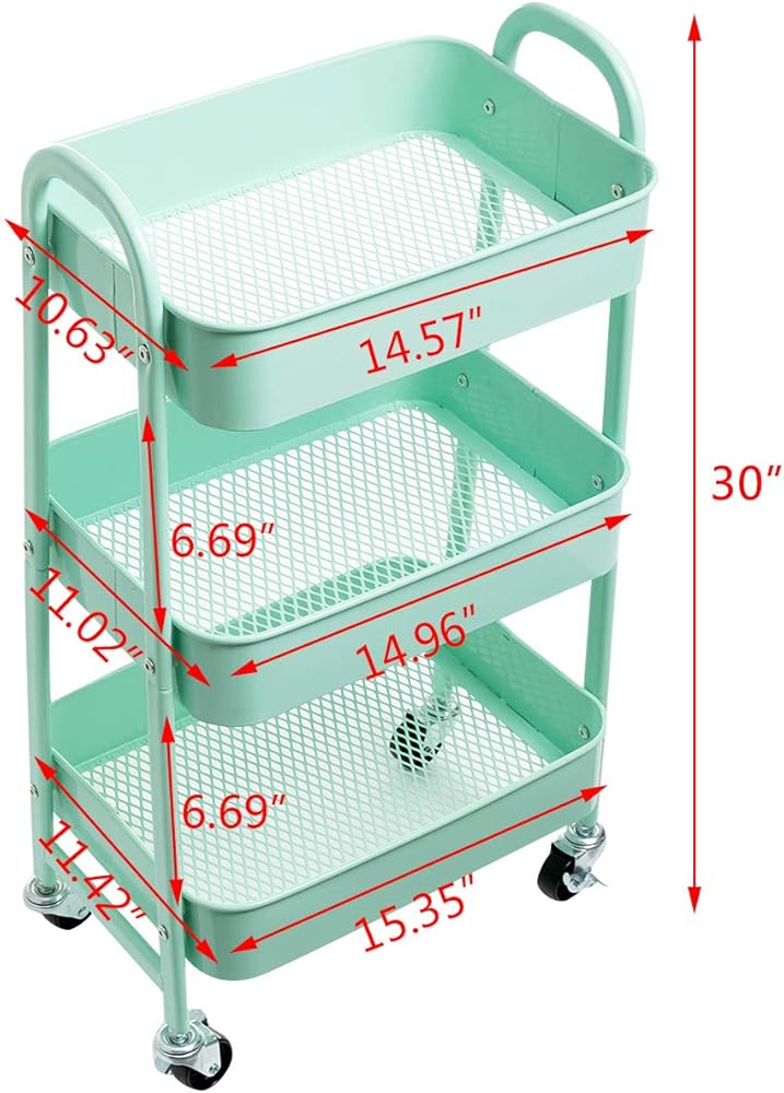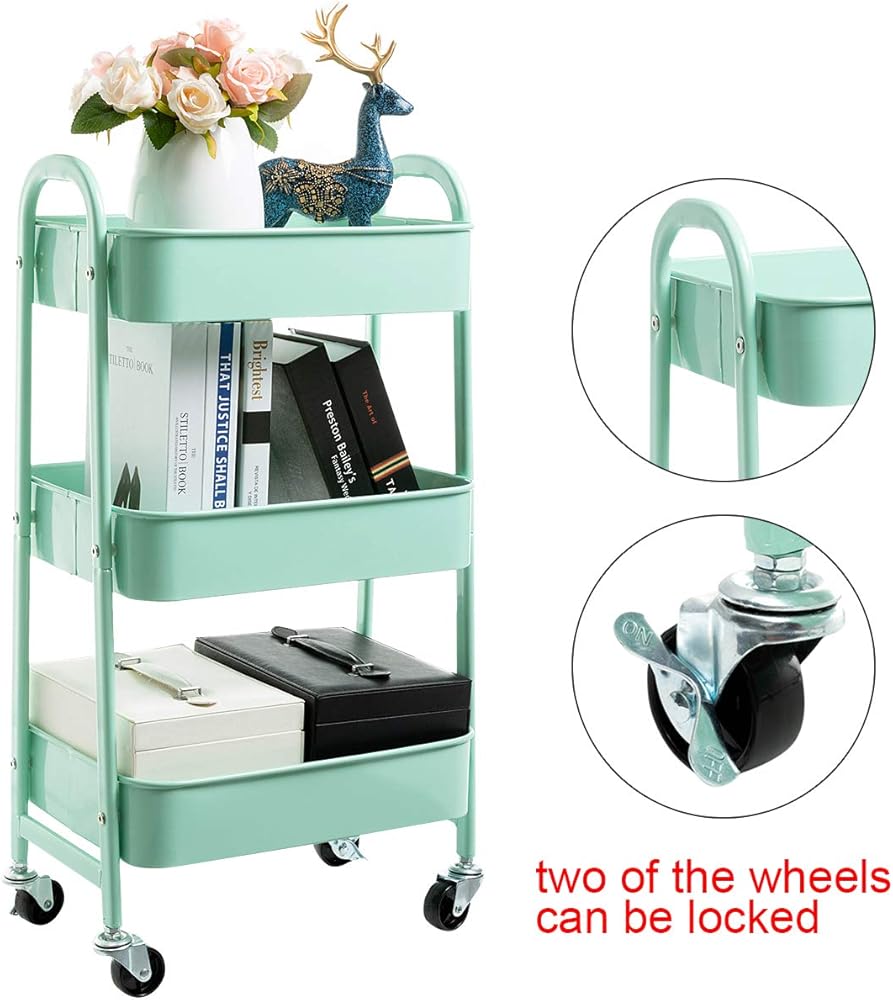 AGTEK 3 Tier Utility Rolling Cart with Lockable Wheels, Metal Multifunctional Storage, Organizer Cart for Kitchen, Office, Living Room, Makeup, Craft, Art Studio, Mint Green