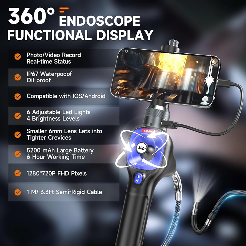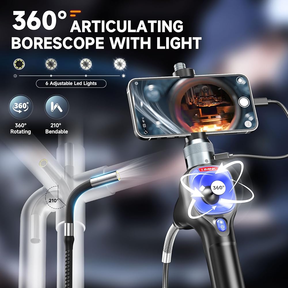 360 Articulating Borescope, LIMINK Industrial Endoscope with 0.24" Articulated Snake Camera, Inspection Camera with Steerable Probe, 6 Adjustable LED Lights, for iPhone and Android - 3.3ft