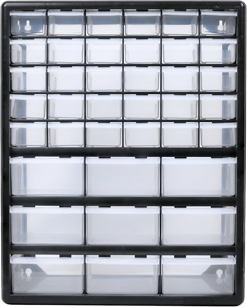 A versatile 39 drawer storage cabinet made of durable hard plastic strong frame with non-breakable drawers. Cabinet can be wall mounted (includes necessary hardware for wall-mounting!)or stacked on a table. Perfect for storing hardware, crafts, sewing supplies etc. all within hands reach. Drawers are translucent to enable to view contents. Drawers also feature finger grip for easy opening and rear tabs to stop drawer from falling and spilling contents!. Cabinet measurements in inches; 9 large size drawers (5 ½” x 4 ½”x 2 1/8”) and 30 medium size drawers; (5 3/8”x 2 ½”x 1 3/8” ) total cabinet measures; 18 3/8" H x 15" W x 16 1/4" D.