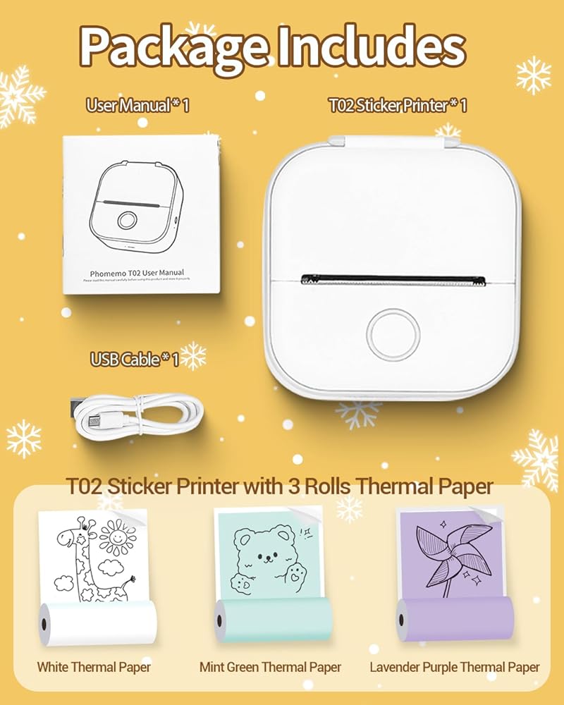 【Easy to Use】Enjoy printing of T02 portable sticker printer in just 3 steps. Step 1: Place the paper roll in your device. Step 2: Download the "Phomemo" app and connect your phone to the sticker maker machine printer. Step 3: Edit your content in the app and print it out!