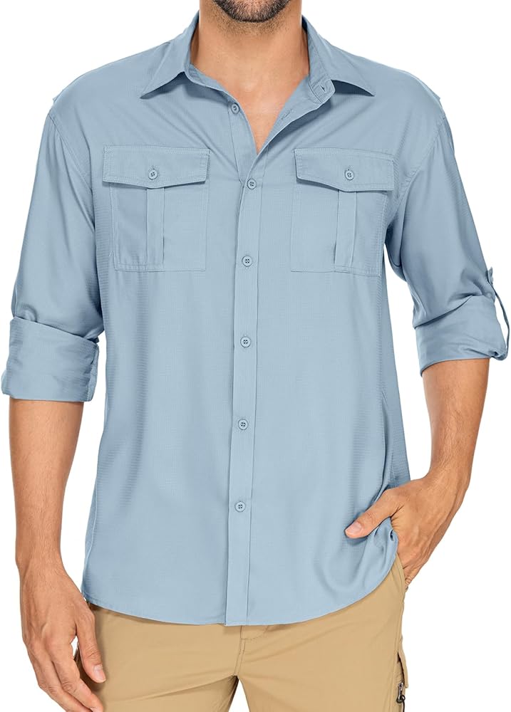 The men's long sleeve hiking shirt features a modern and classic casual cut, featuring two chest pockets with closures and a sunglasses hanging loop for easy access to essential items.