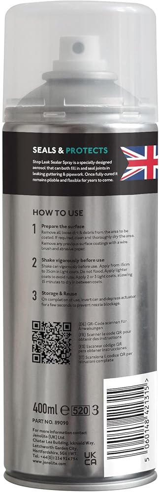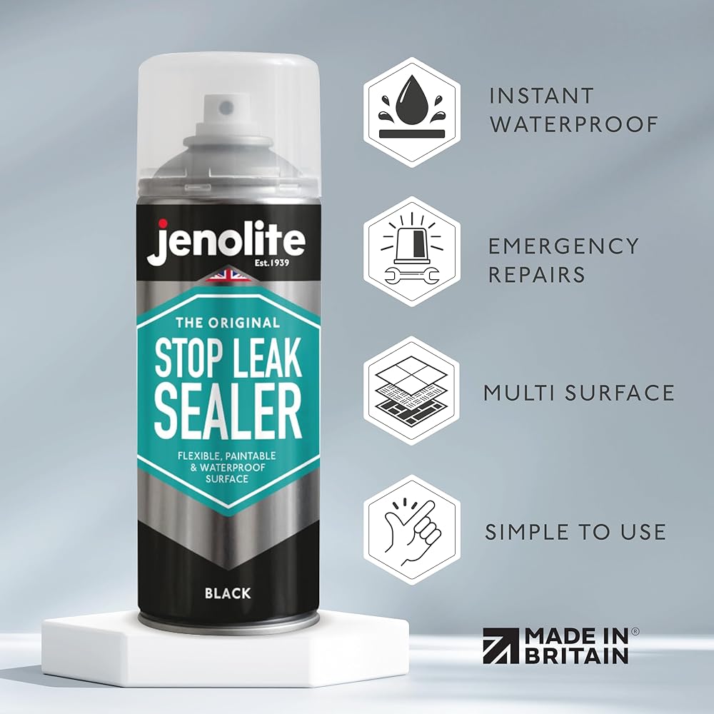 JENOLITE Stop Leak is the instant waterproof sealant. Ideal for sealing leaks and drips fast. The hardwearing, flexible formulation has been specifically developed to fill & seal joints in leaking guttering, downpipes, pipework, drains, windows, roofs and other leaking areas. Stop leak's gap filling properties make it perfect for the sealing of leaking joints, that have become loose due to weather and corrosion. Available in Black, White and Clear Finish.