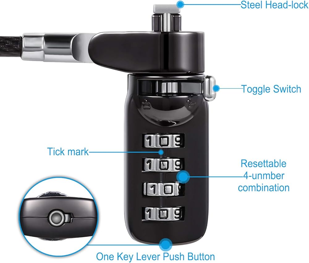 【Laptops Lock Cable】The lock head is made of super strong stainless steel .The lock head pivots 180 degree to ensure easy access to lock.The cable made of hardened steel wire instead of iron wire.The cable has anti-cutting capability.The steel cable joint can withstand a pulling force of up to 1800N,while the steel cable ring can withstand a pulling force of 1200N without breaking.