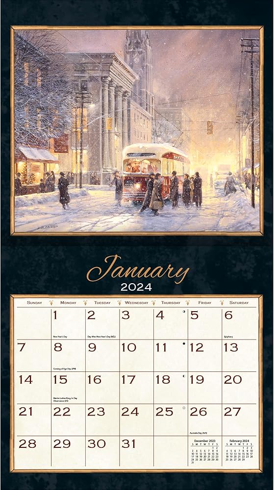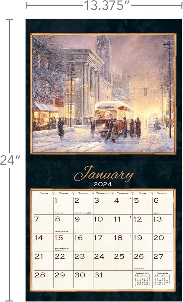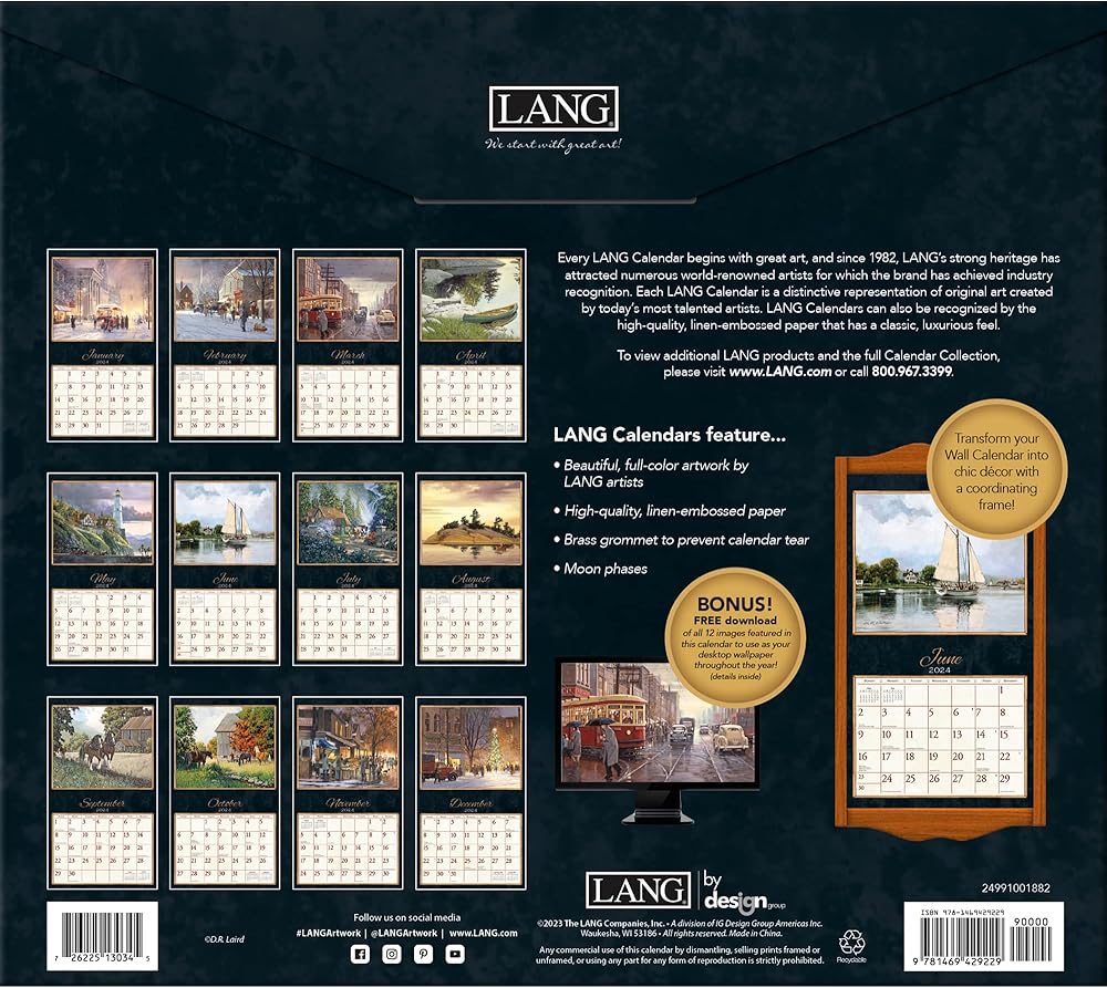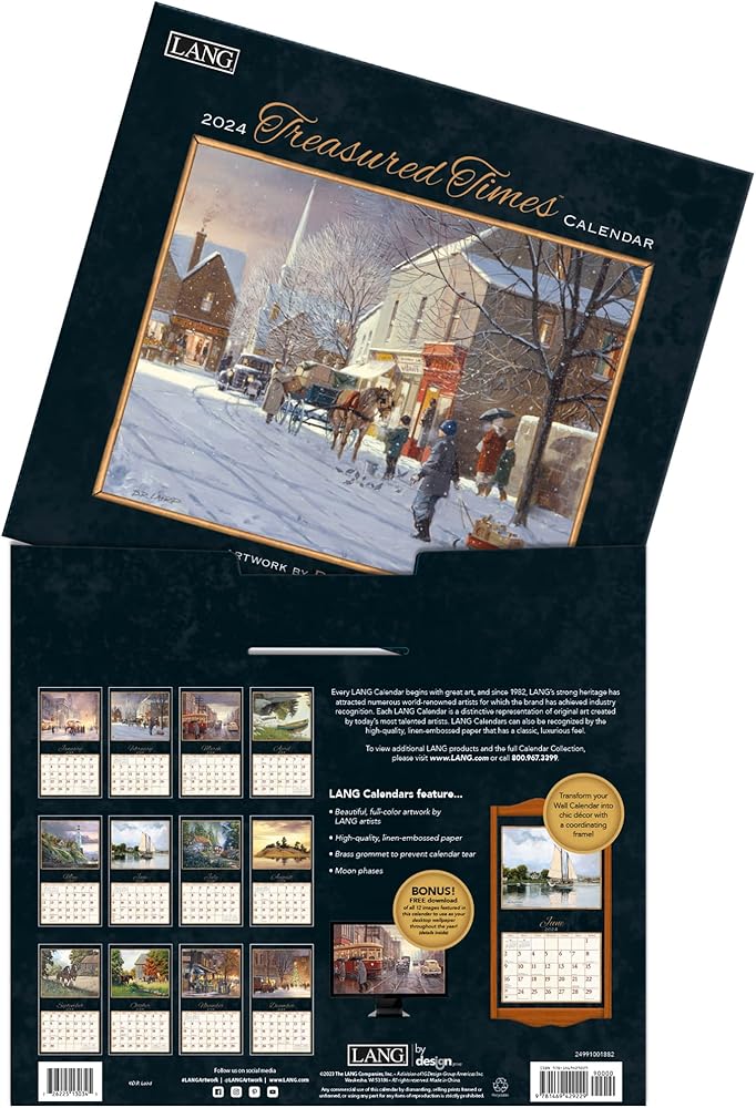 Lang 2024 Treasured Times Wall Calendar by D.R. Laird. 12 month calendar spanning January - December, 2024, with an elegant linen embossed paper stock. Includes a brass hanging grommet to prevent calendar from tearing