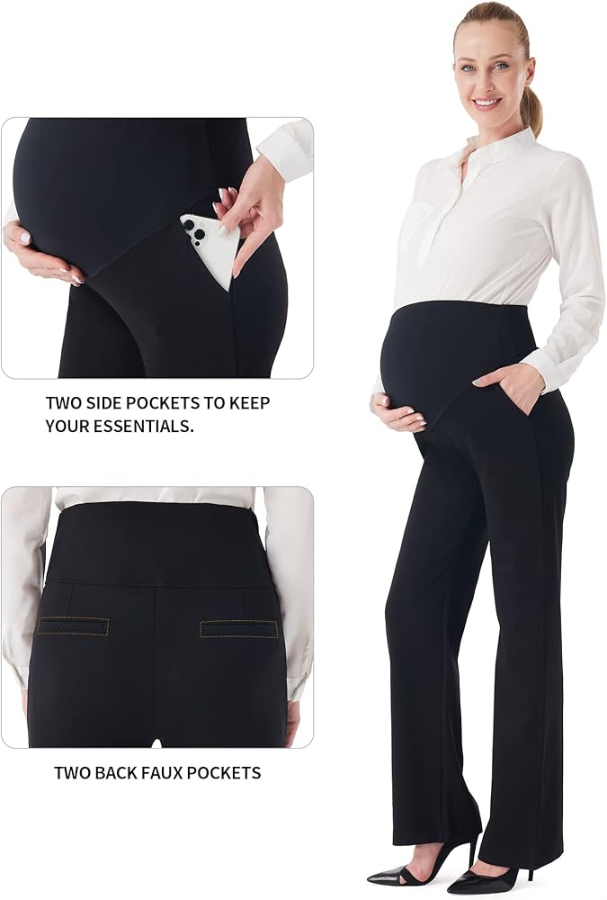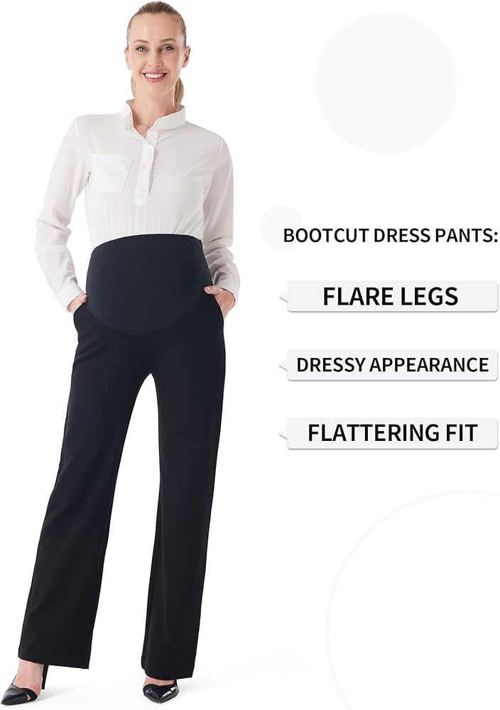 Bootcut Dress Pants: Maternity pants for work are made with flare legs, a formal appearance, and a flattering fit all day, making them a must-have for a professional mom-to-be. Stretchy pregnancy pants are perfect for office work, meetings, and everyday use. These classic maternity pants for ladies can be worn throughout your pregnancy.