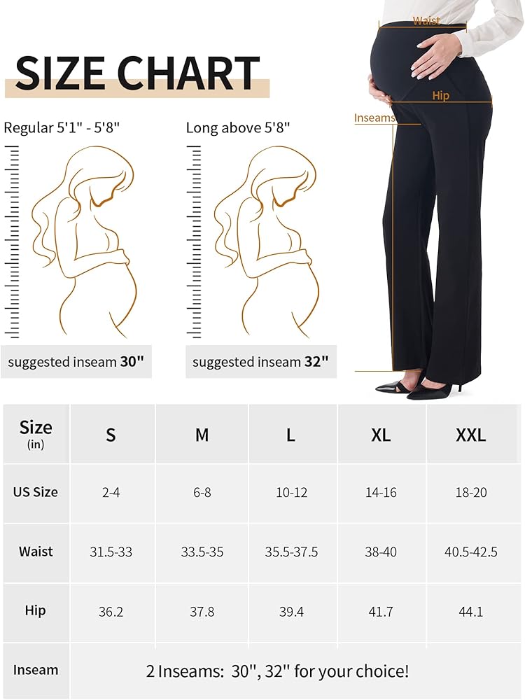 2 Inseam Lengths: These women's elastic pregnant pants feature two inseam lengths: Women's regular - 30" inseam 5'1" - 5'8" / 32" inseam fits women over 5'8" To determine the correct length of pants, please refer to the sizing chart. There are long maternity trousers as well as ordinary pants for ladies.