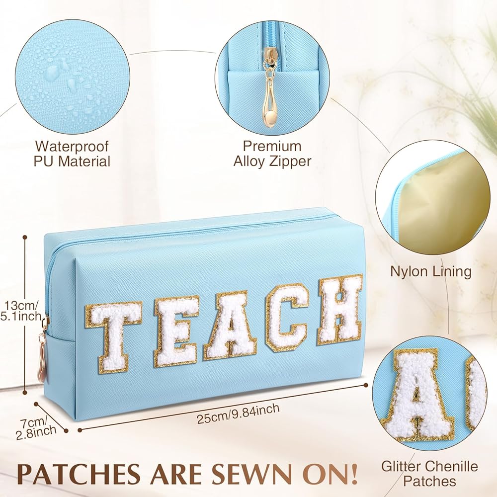Nice Workmanship: cute cosmetic bag has gold glitter letter patch, and lightning, smile face and heart pattern, which stitched securely on the bag so you do not have to worry about them falling off; These delicate patterns make your travel cosmetic bag look more attractive