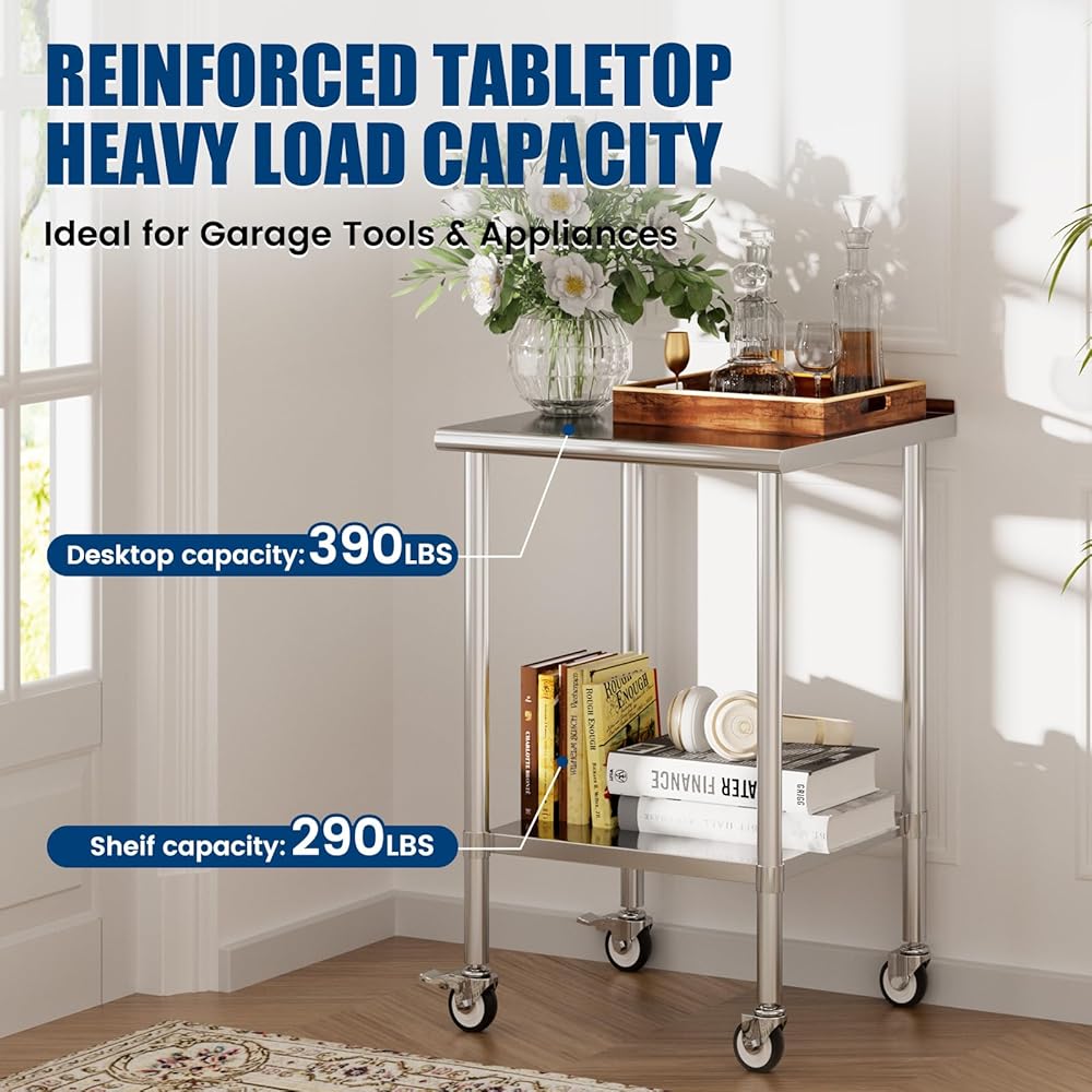 Convenient Movement: This stainless steel kitchen prep table has four 360° rotating wheels, these caster wheels are very quiet and smooth while rolling. In addition, two wheels have top brakes, ensuring the table remains still at any time