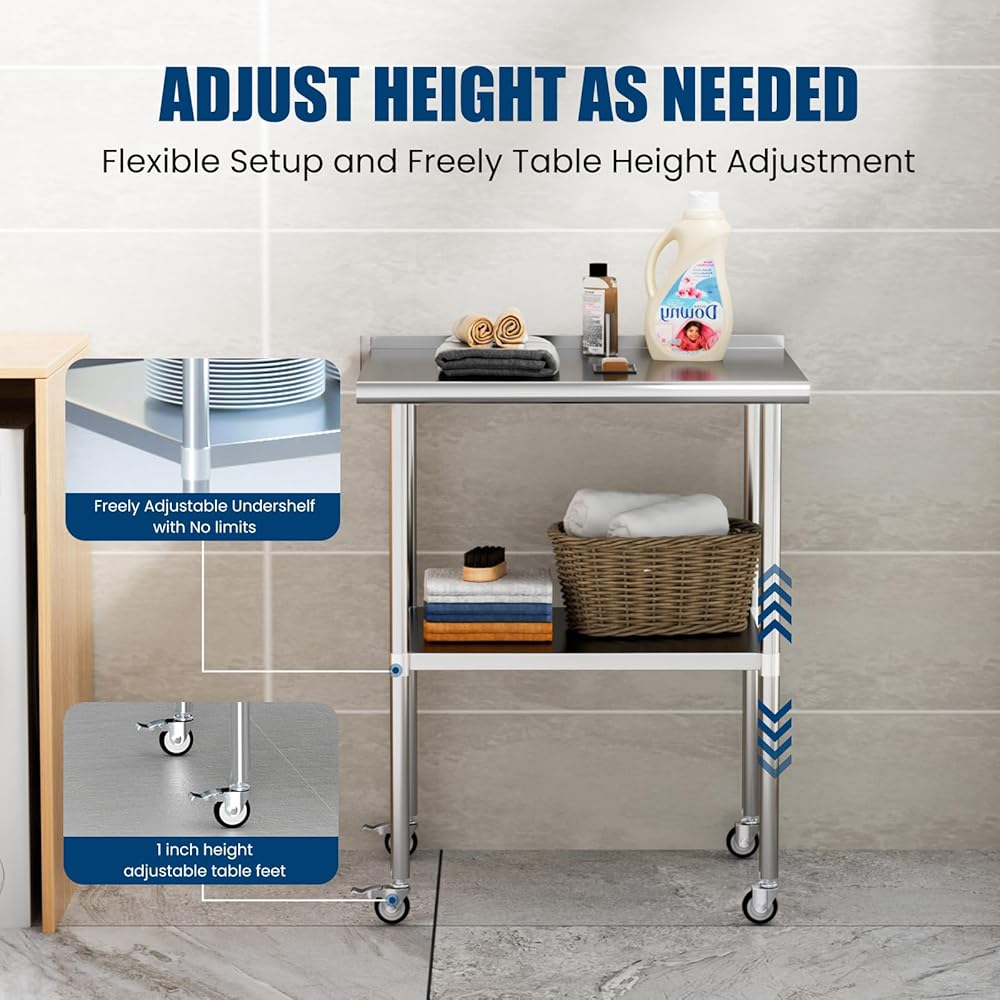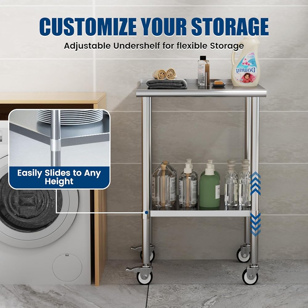 Easy to Clean & Adjustable: with surface drawing treatment, this stainless steel work table makes water, dust and oil easy to clean. You can raise or lower the undershelf to accommodate the size of the items you need to store, organize your frequently used items well