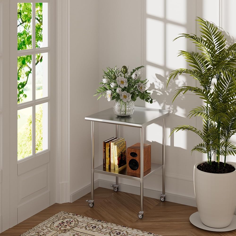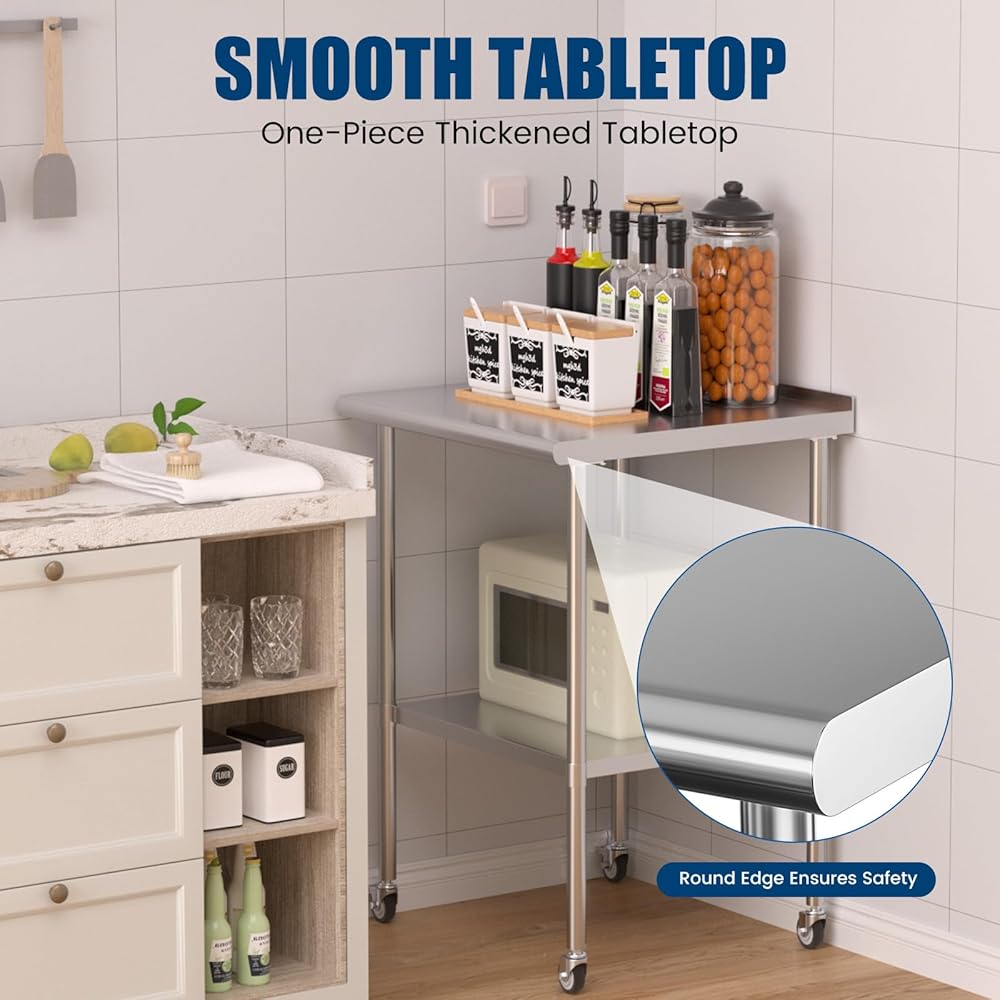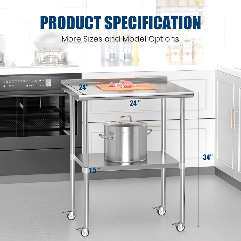 Stainless Steel Work Table with Wheels, 24x24 Inch NSF Food Prep Worktable with Backsplash & Adjustable Undershelf for Commercial Kitchen, Restaurant, Garage, Outdoor BBQ