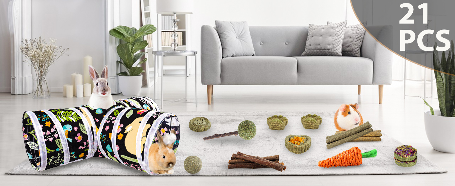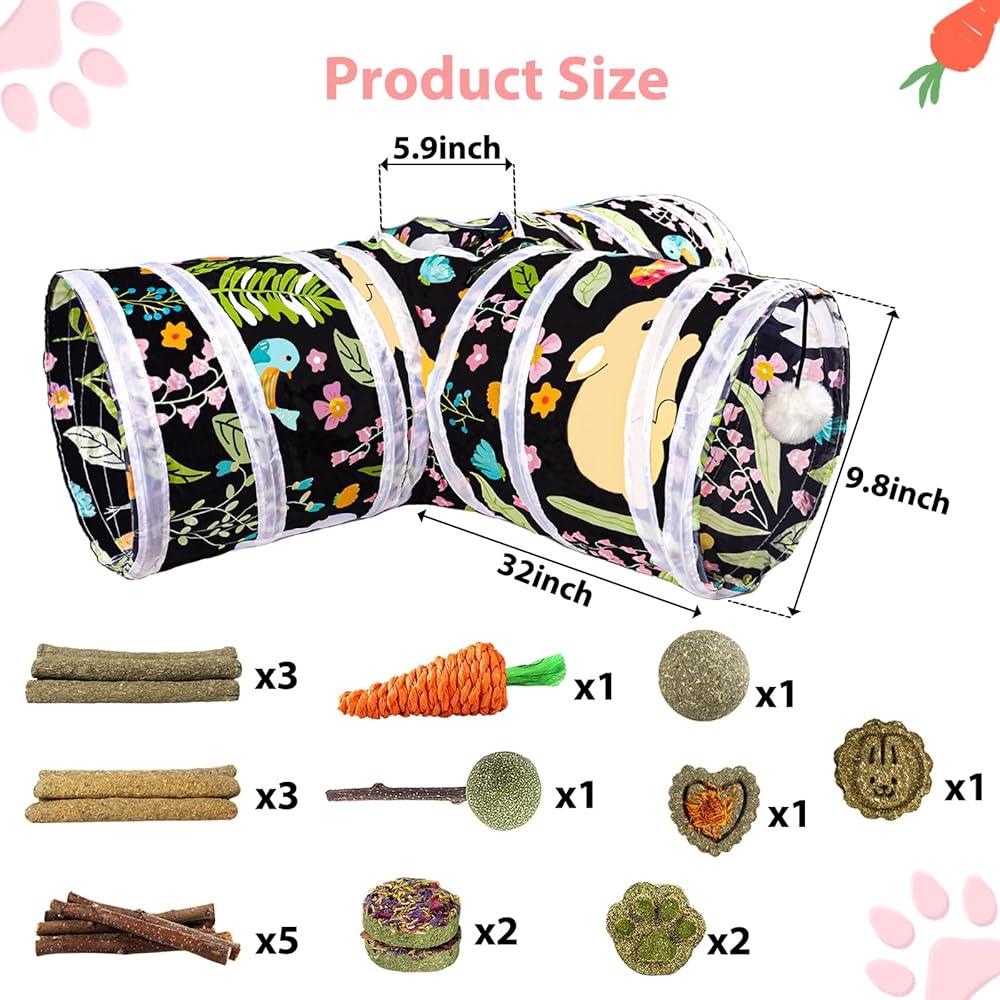 【21 Pcs Set】Our small animal Tunnel Set includes 1x 3 way pet tunnel,1x grass woven carrot,5x apple wood sticks,3x timothy hay sticks,3x calendula grass stick,2x circular grass cakes and 2x cute grass cake pieces,1x timothy grass ball,1x rabbit shape grass cake,1x heart-shape grass cake,1x grass lollipops. The popular rabbit toy gives your bunny more ways to have fun.