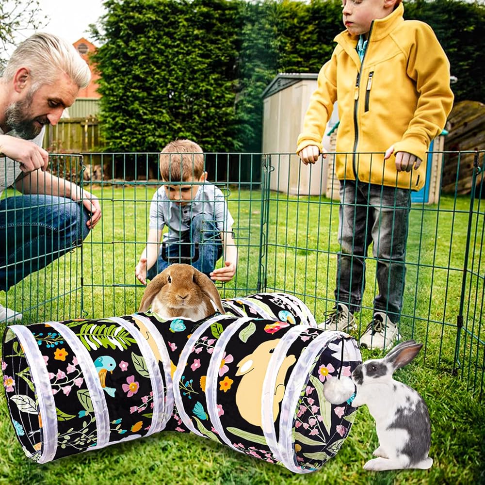 【High Quality Materials】That bunny tunnels made of an ultra-strong, tear-resistant polyester, It is supported by a flexible steel wire frame with protective ends this tunnel, don't worry about scratching and deformation.It's supported wash by hand or wipe with a rag. Rabbit toys are very practical and beautiful. It can facilitate exploration for rabbits.