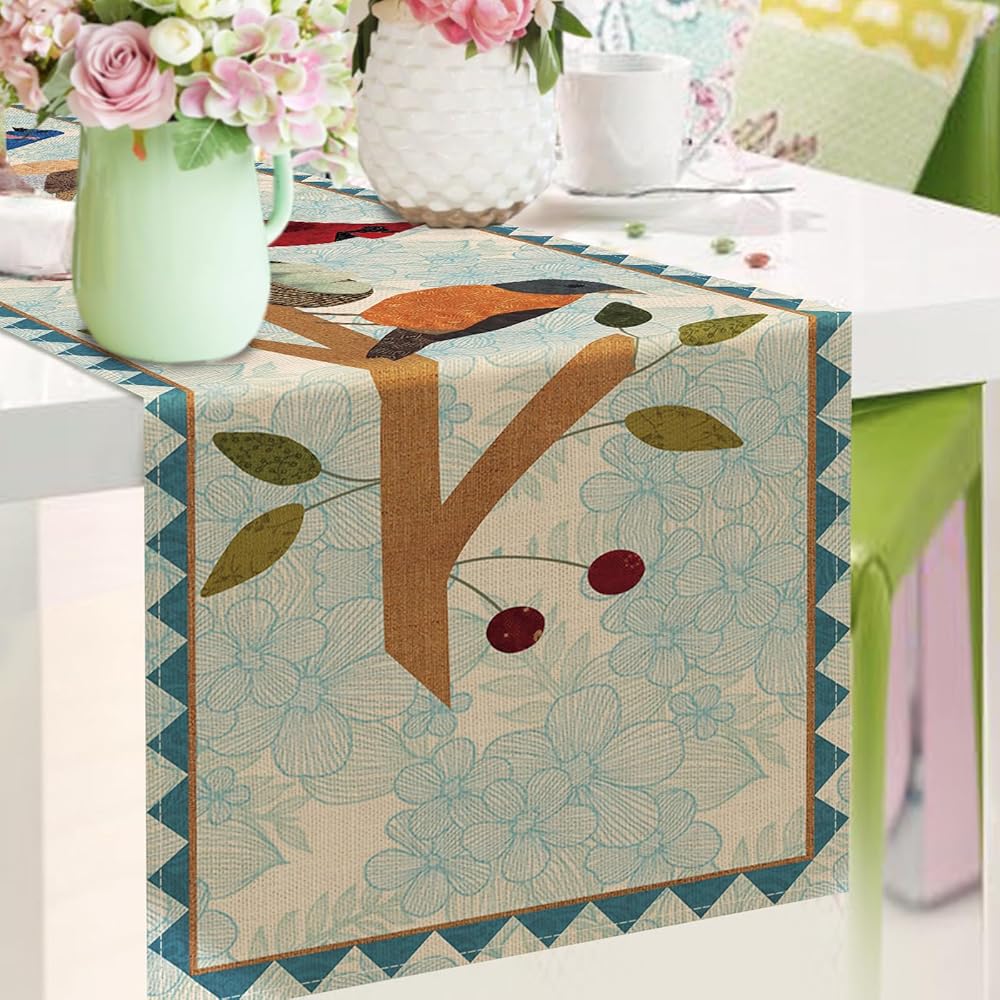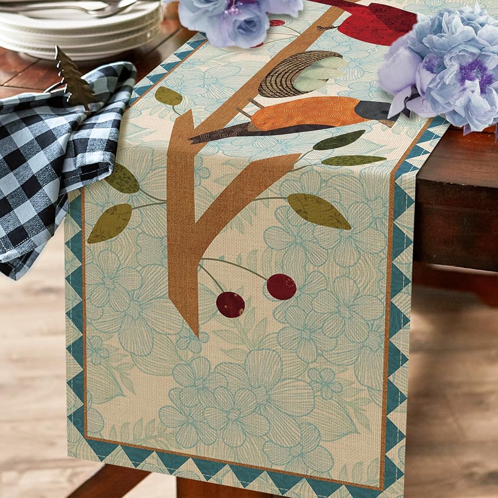 Farmhouse Table Runner: Our green rustic linen floral bird print table runner adopts the most popular element design nowadays, which can add fashion and vitality to your house. Use the various themed seasonal flower table decorations we provide to decorate your coffee table, porch table, buffet table, dining table and kitchen to express your positive attitude towards life. Printed with vivid bird patterns like robin, bluebird, bullfinch and chickadee
