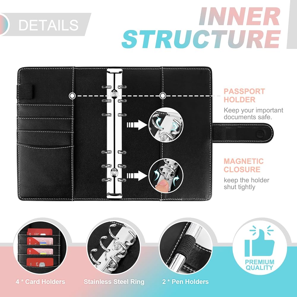 【Premium Material】A6 binder is made of premium soft textured faux leather, which is durable and water-resistant. Budget binder with strongly attractive magnet, the magnetic buckle can be easily closed very tight.