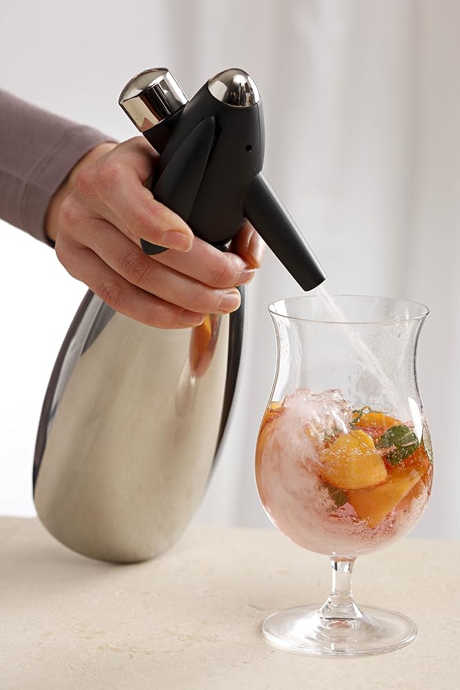 Enjoy the Classic style and convenience of the iSi Stainless Steel Soda Siphon. Fast and easy carbonation for hand crafted drinks. The iSi siphon uses CO2 gas chargers to carbonate 1 quart of water. Add sparkling water to craft cocktails, wine, juice, or any beverage that needs a little fizz. Enjoy sparkling water straight from the fridge. The retro stainless steel design has been recreated for today's consumers - an easy, convenient and eco-friendly way to make and store carbonated water without electricity and counter-top clutter. Made in Austria, the Stainless Steel Soda Siphon uses iSi CO2 chargers sold separately from your authorized dealer.