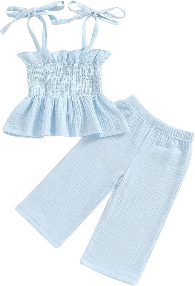 What You Get - 1x Sleeveless crop top + 1x long pants. Summer 2 piece cotton linen clothes set for baby girls.