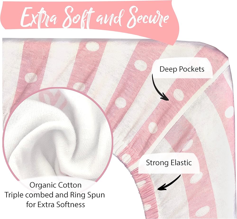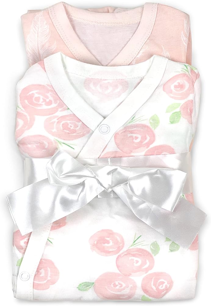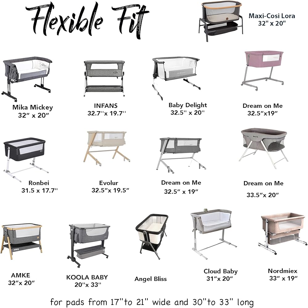 Both of these products are made from 100% pure,soft organic cotton. Bedside sleeper bassinet pads of different brands vary slightly in size. The 2 pack of fitted sheets stretch to fit Mika Micky, Baby Delight, Ronbei, Koola Baby, Cloud Baby, AMKE, Angelbliss, Maxi-Cosi, Arm's Reach, Besrey, Papablic, Cowiewie, 4Moms MamaRoo, Chicco LullaGo, Chicco LullaGlide, KoolaBaby, KoolerThings, Ingenuity, Nordimex, Vavasoo, Simmons, Graco, Evolur, Pamo Babe, Earth Me, Bellababy, Ricuton, Skip Hop, MiClassic, Fodoss, Delta, and all other pads between 17-21” in width, X 29-33” in length, and 1-2“ thick. Our cotton is woven into a soft jersey knit, making it a dream for your baby to sleep on,or in! Make diaper changes a breeze with the side snap gowns. Unbutton the snaps at the bottom to change diapers without having to pull clothing over your baby's head. Easily re-snap when finished. When dressing lay baby on unsnapped gown and slip arms into the roomy sleeves. No need to sit baby up! Elasticized bottom helps keep tiny toes warm at night. They fit most babies 0-6 months old. The sheets plus the matching gowns as an ideal gift combination for a newborn boy or girl.