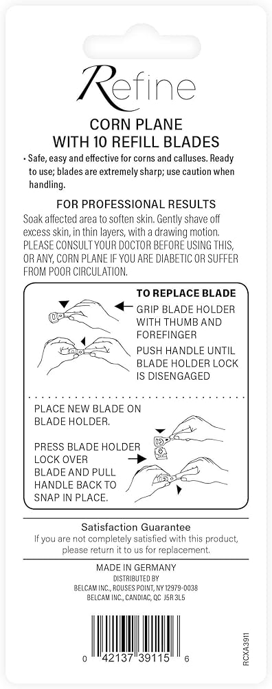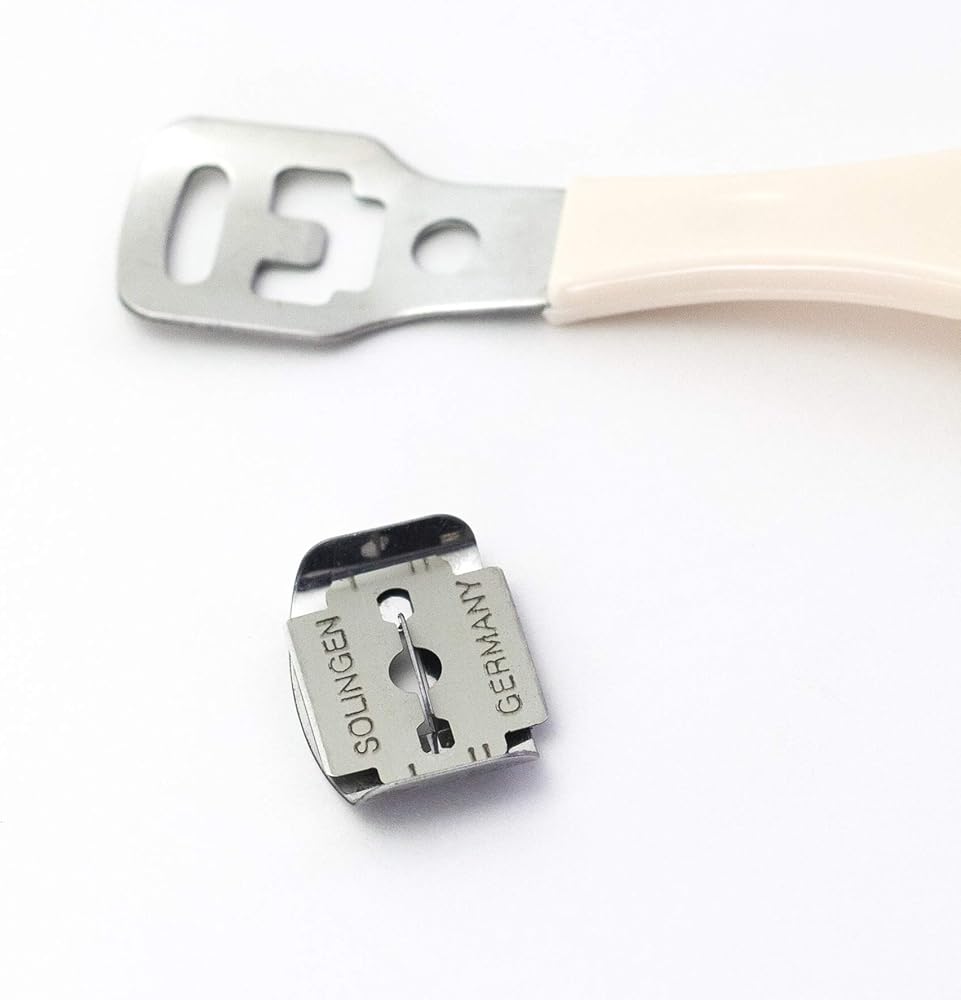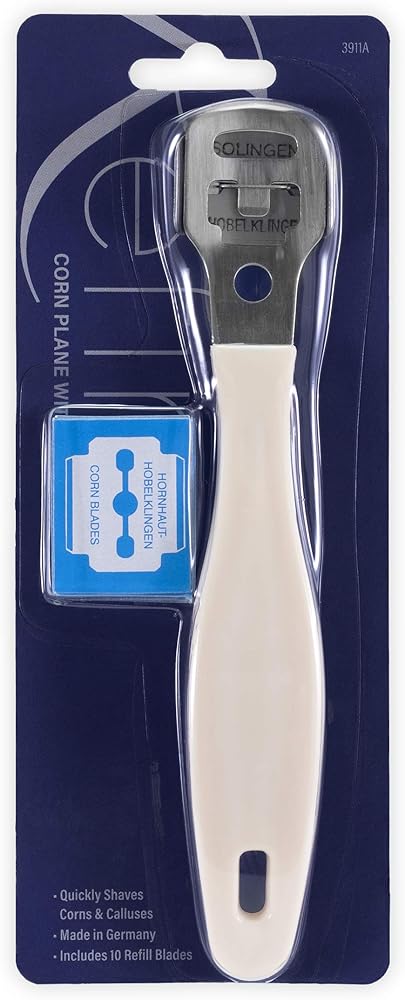 This high quality Corn plane is made in Germany and features a sturdy, plastic handle and a secure, metal blade holder. The sharp, German-made blade shaves thin layers of unwanted skin from corns and calluses. When worn, the blade can be replaced with a new one. The corn plane is shipped ready-to-use, with a blade in the holder, and includes an additional box of 10 refill blades.