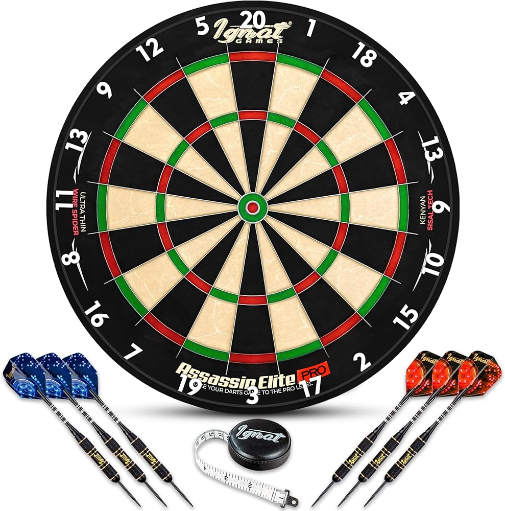 IgnatGames Dartboard Professional Set - Competition Size Kenyan Sisal Dart Board for Adults - Staple-Free Ultra-Thin Wire Spider with Accessories & 6 pcs Premium Darts