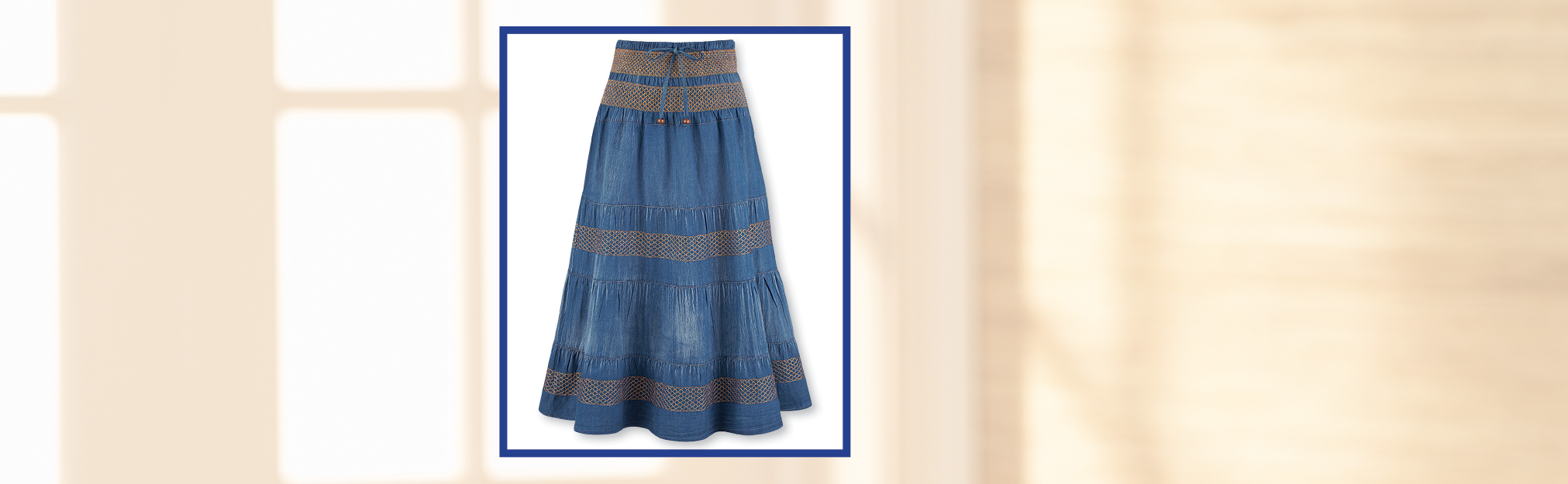 Stylish and casual denim skirt features four crochet panels, a smocked waistband with faux drawstring and smocked tiers