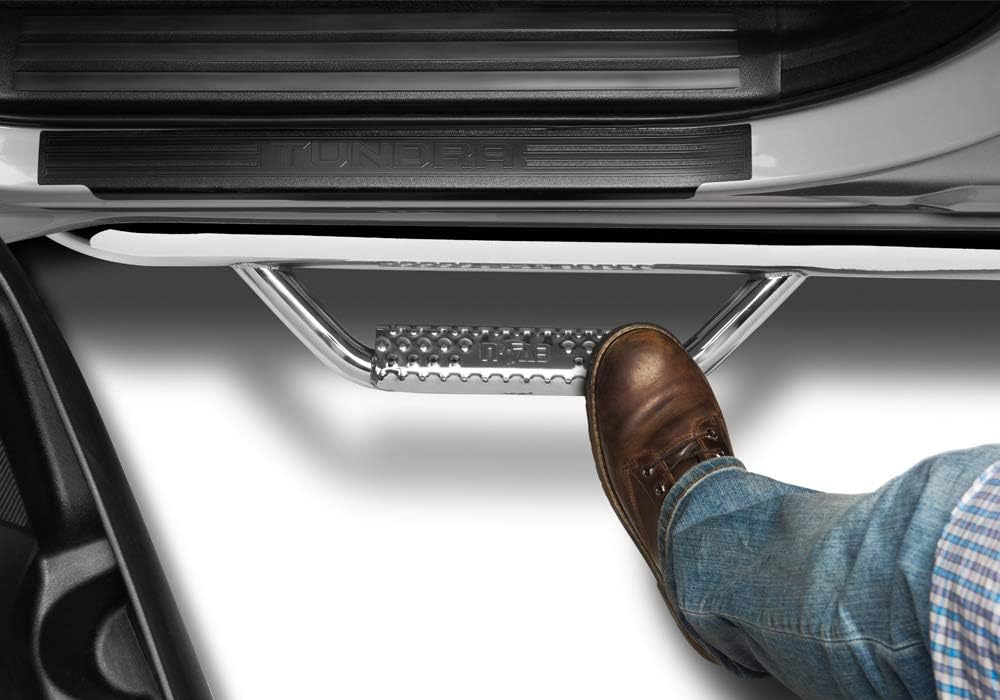 N-Fab's Podium Steps feature a clean design that fits high and tight to the vehicle body in either premium textured black (LG) or high polish stainless steel (SS) finishes, adding to the modern look of your ride. The fully welded 1-piece construction and 3" main tube diameter offer strength and durability. With a patented drop down hoop step with expanded sure grip step plate at each door, Podium Steps allow for easy access to your stock or lifted truck and deliver reliable traction and stability in any weather condition. Installation is easy. Includes all mounting hardware and easy to understand, vehicle specific instructions. N-Fab products are backed by an industry leading 5-year warranty on the product's finish, and Limited Lifetime warranty on workmanship.