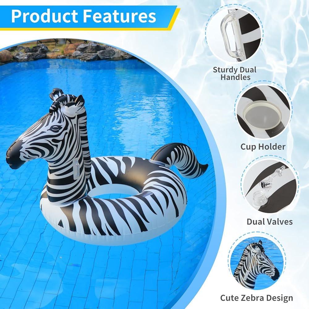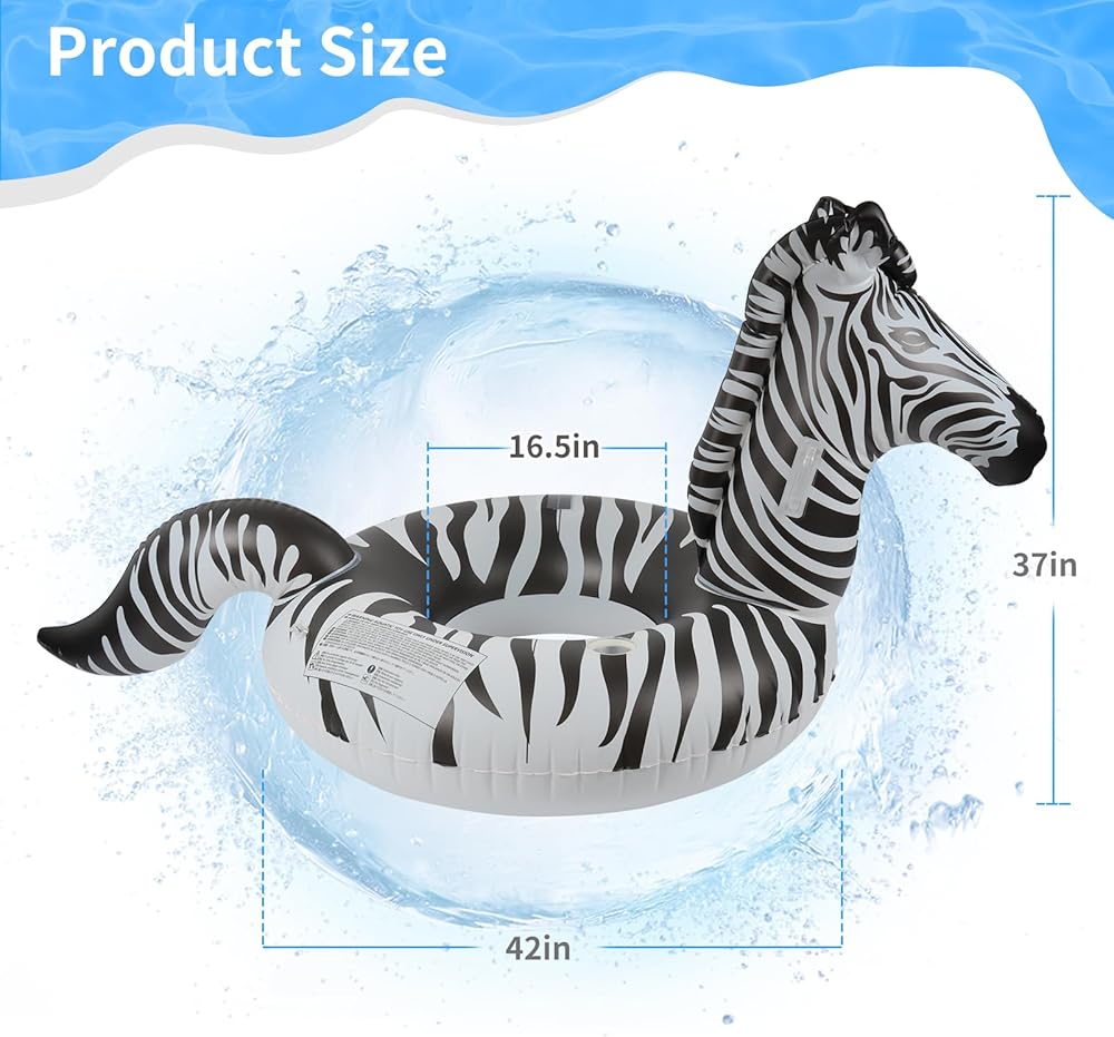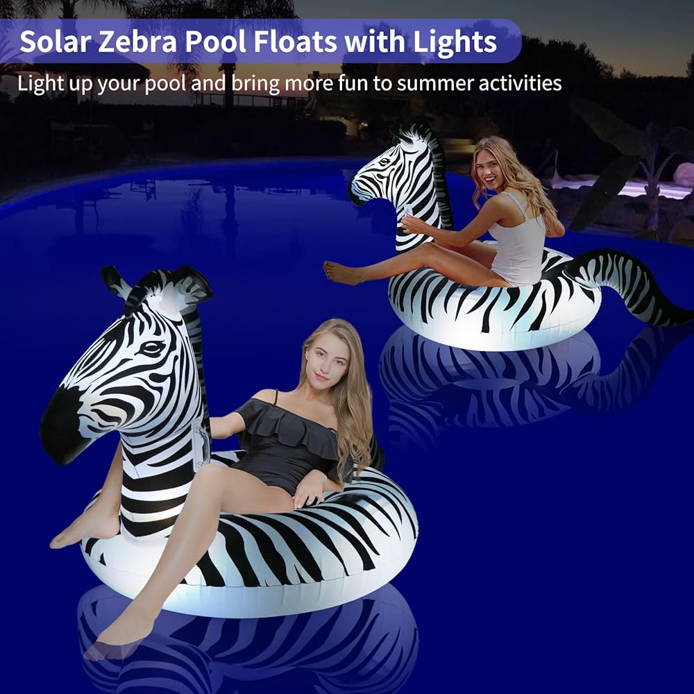 【42'' Large Size Design】The size of inflatable zebra pool tube is 37in (High)* 42in (Outer diameter)* 16.5in (Inner diameter) after fully inflated. The size is fantastic, It's perfect for adults and is quite strong and durable. Whether you're relaxing in the pool, floating on a calm lake, or enjoying a day at the beach, this inflatable zebra pool float with solar lights provides a comfortable and entertaining experience.