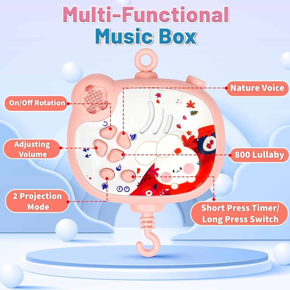 【Perfect Gift For Infant】:The crib mobile with music and lights is a perfect gift for 0 6 12 18 M+ year old baby.5 hanging cute and cartoon baby toys which rattle can be bitten. Newborns travel comfortably on this earth.