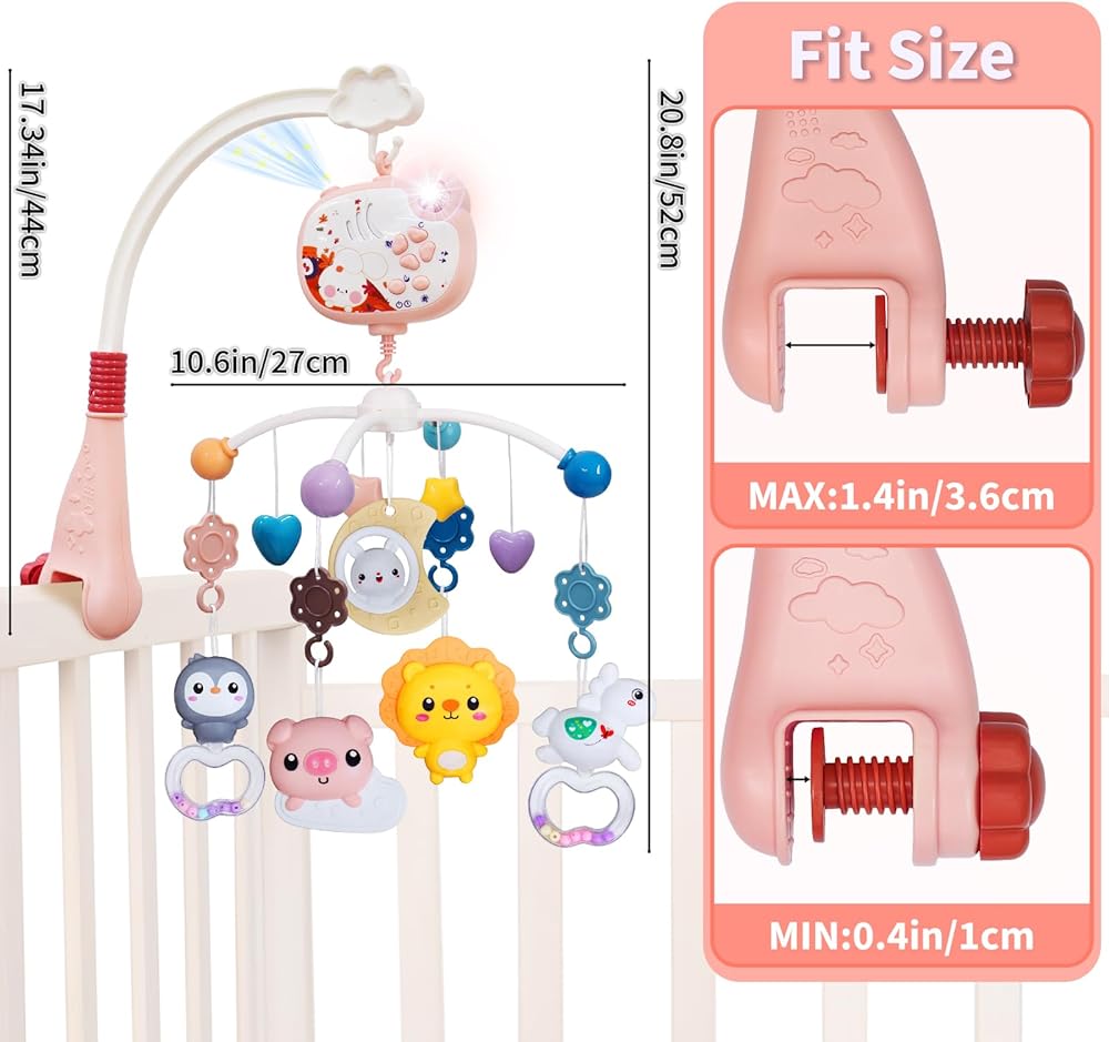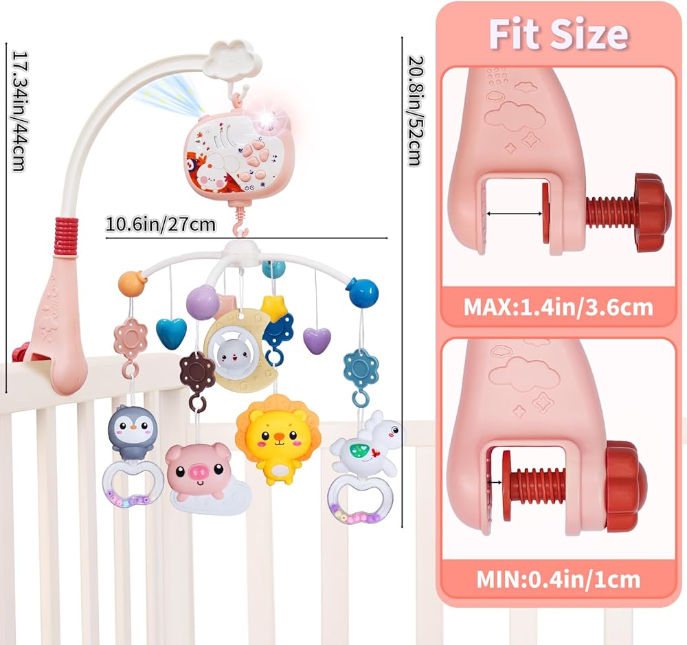 【Safe Crib Mobile】:Crib mobile is made of safe ABS material, the adjustable arm of the mobile can be mounted on any bed caliber crib smaller than 1.6 in.
