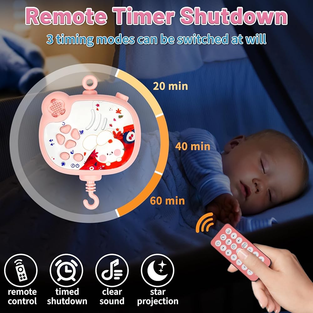 【Remote Control & Timer 】:Baby Crib Mobile with Remote Control - with a remote control to turn on or off, control the crib Mobile's rotation, volume and light, freeing mom's hands.