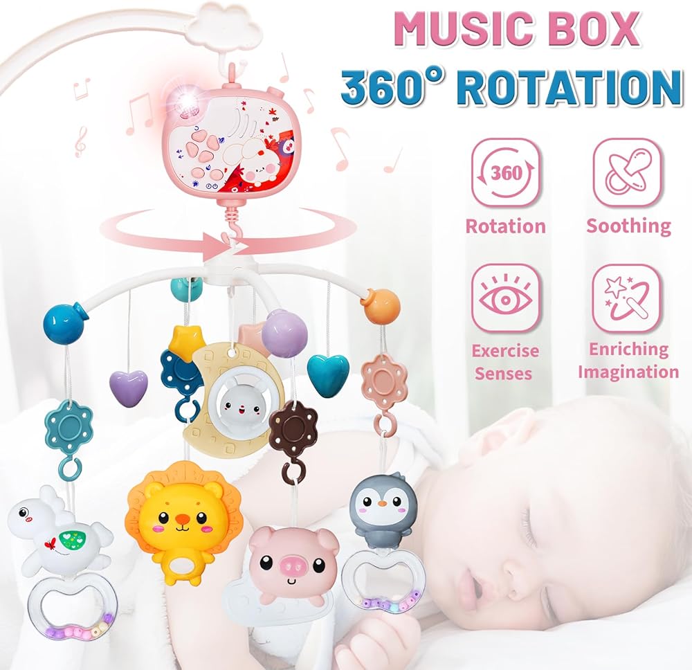 【Baby Crib Toys】: Baby Mobile includes a music box with adjustable volume and soft lighting that plays lullabies. With the soft music, the animal rattles slowly rotate to accompany and soothe your baby to a sweet sleep.