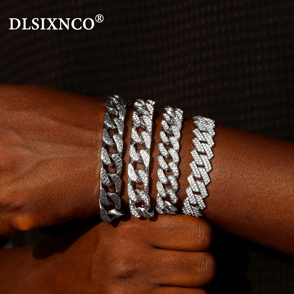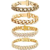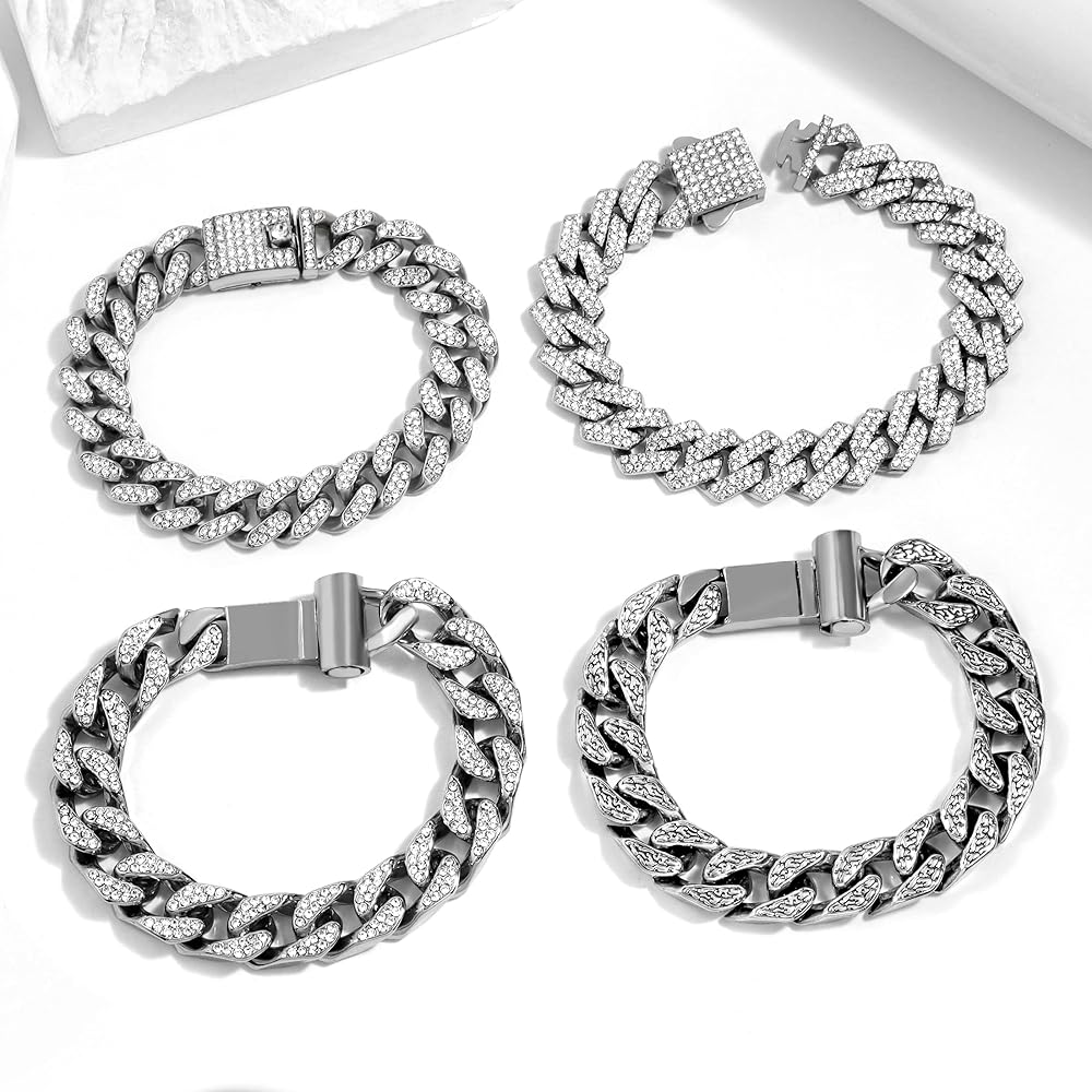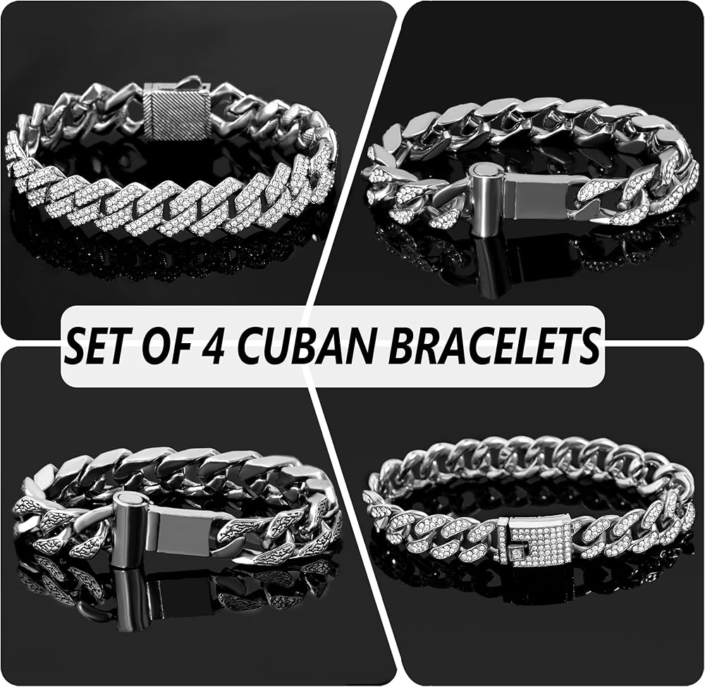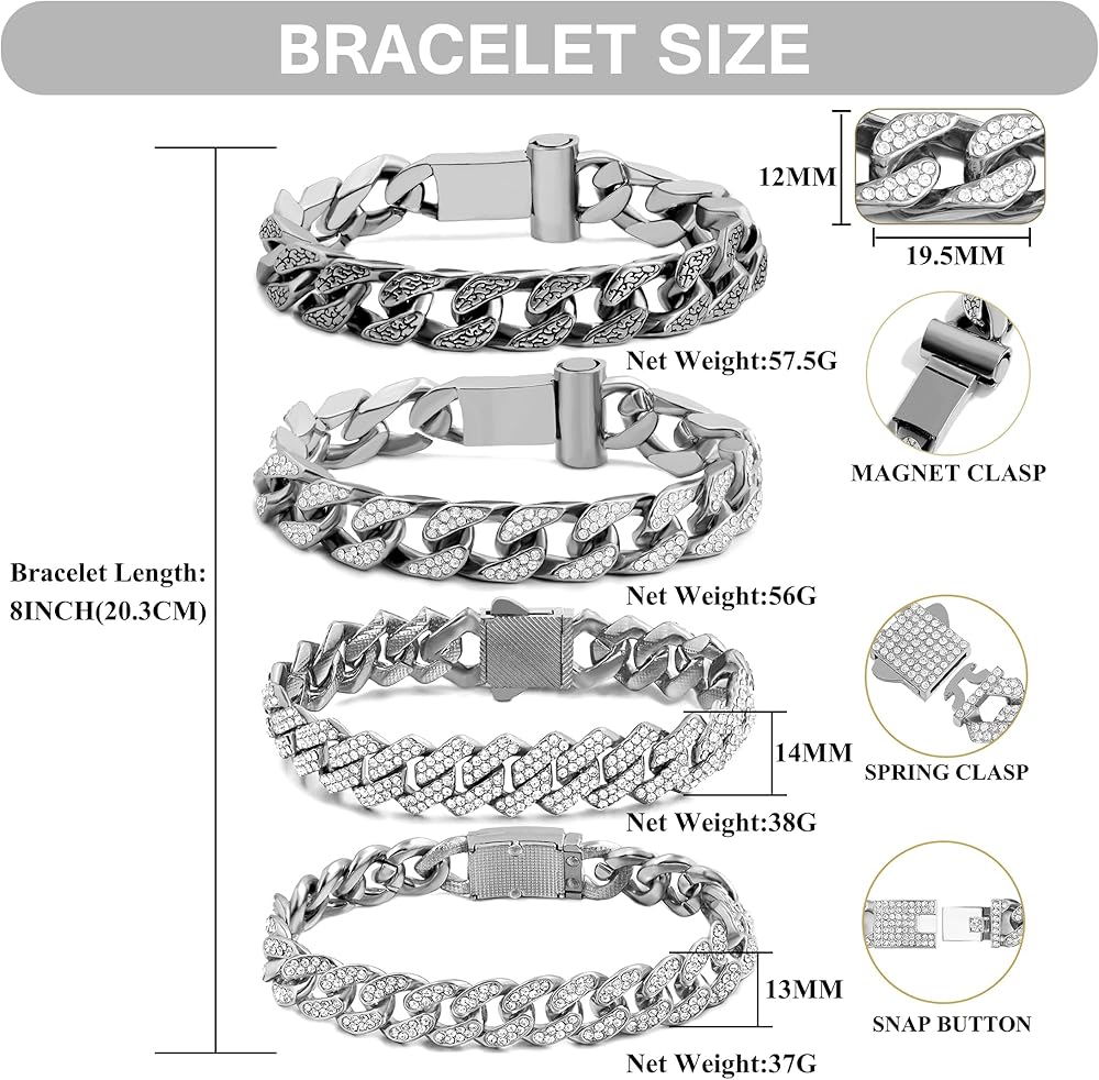 Cuban Chain Bracelet Set:A set of 4 exquisite cuban chain bracelets for men and women, in gold bracelet and silver bracelet colors.The collection features 13mm diamond cuban chain, 14mm diamond cuban chain, 12mm diamond cuban chain, and a vintage-inspired 12mm cuban chain.