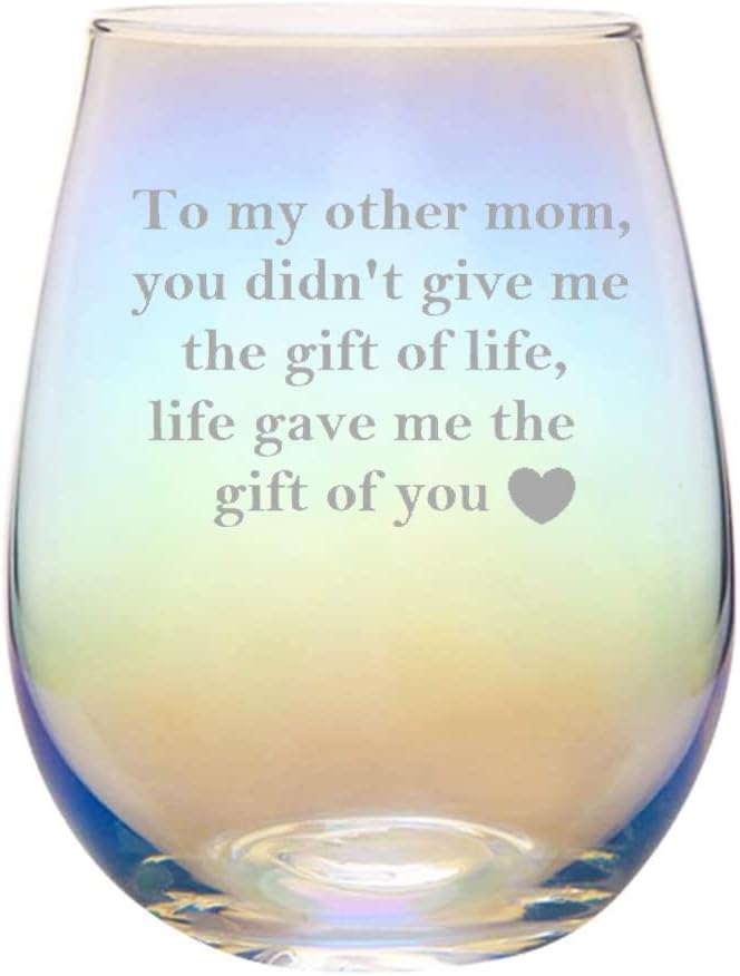Show your appreciation and love for your other mom with this beautiful and heartfelt wine glass. This wine glass features a rainbow design and a sweet message that reads “To My Other Mom, Life Gave Me the Gift of You”. he glass is made of high-quality lead-free crystal that is durable and dishwasher safe. The glass has a capacity of 18 oz and a stemless shape that is easy to hold and swirl. This wine glass is a perfect gift for your other mom on Mother's Day, birthday, Christmas, or any other occasion. It is also a great way to express your gratitude and affection for your other mom who has been there for you through thick and thin.