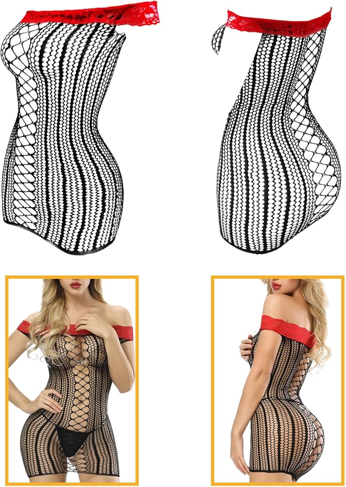 FasiCat Womens Lingerie Fishnet Dress Sexy Lingerie Set, See Through Mini Dress Fishnet Bodysuits Stockings Mesh Babydoll Bodystocking for Women One Size