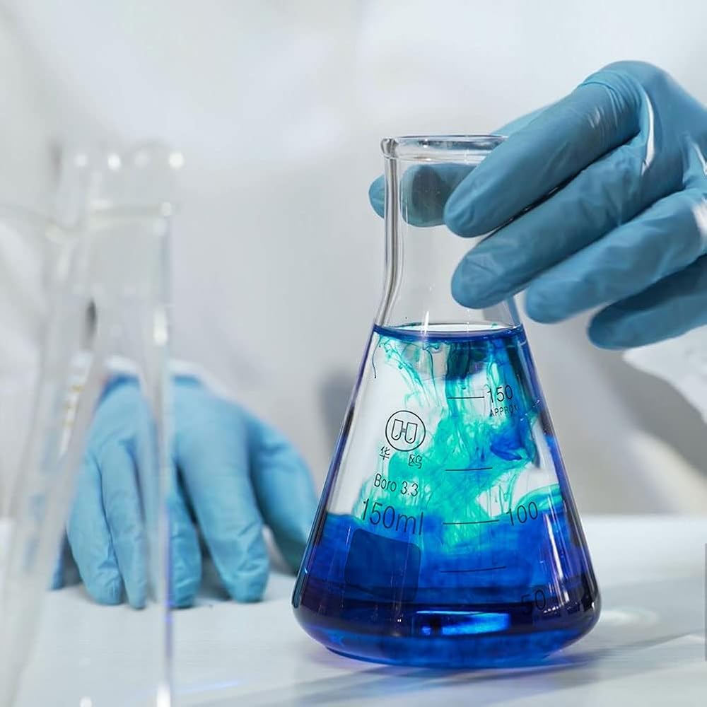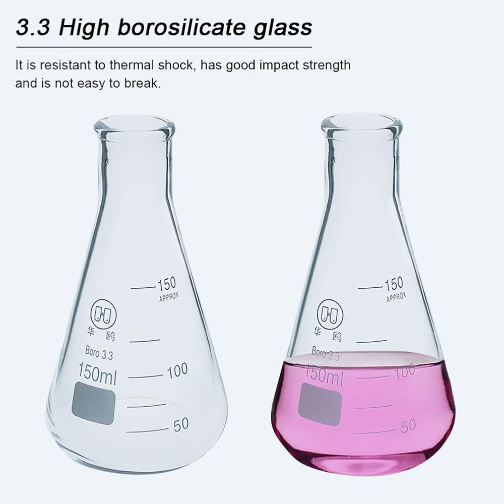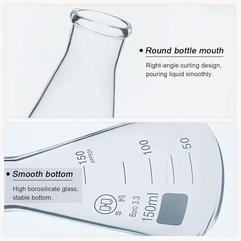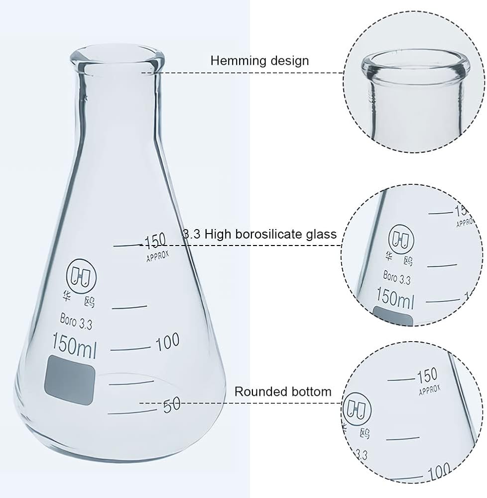 Flat Bottom: A flat-bottomed lab erlenmeyer flasks allows it to stand upright on a flat surface without resting on bottle clamps or cork racks.