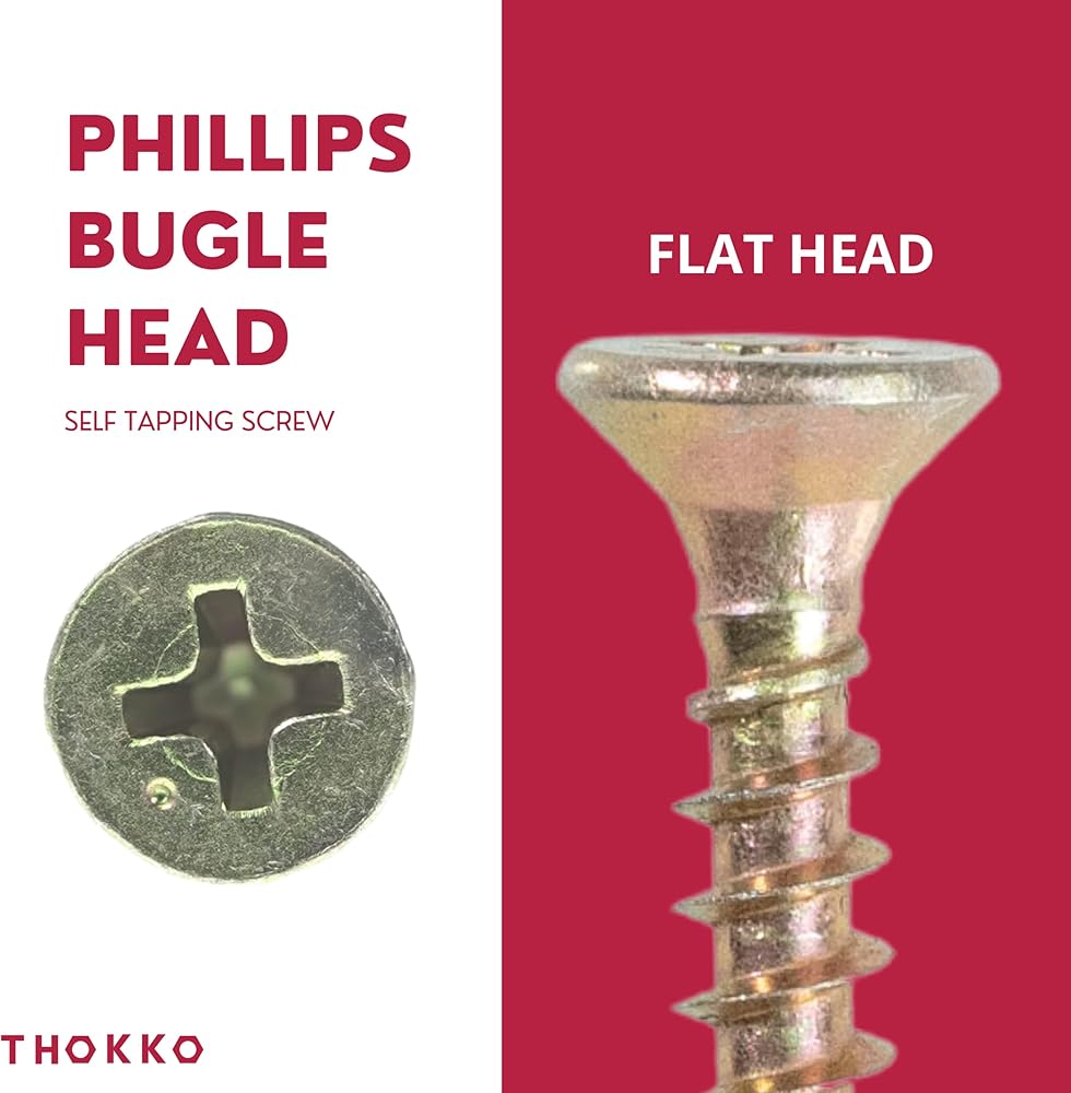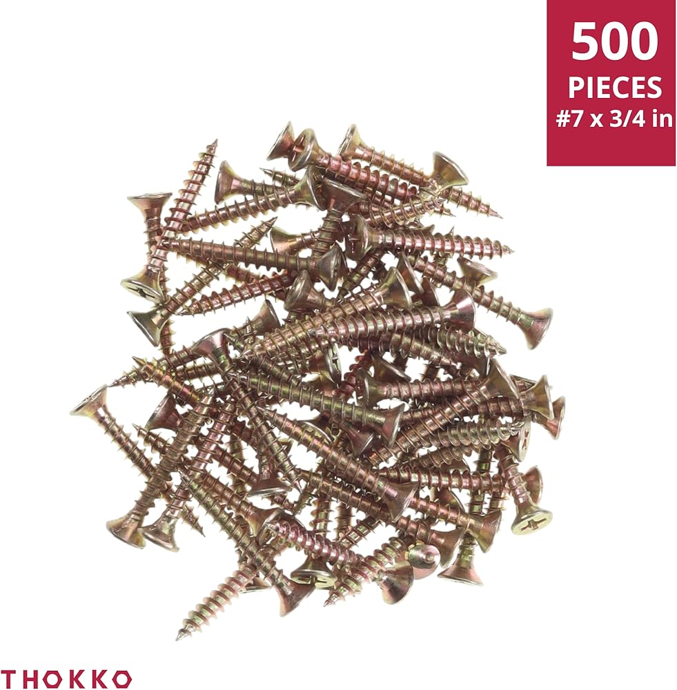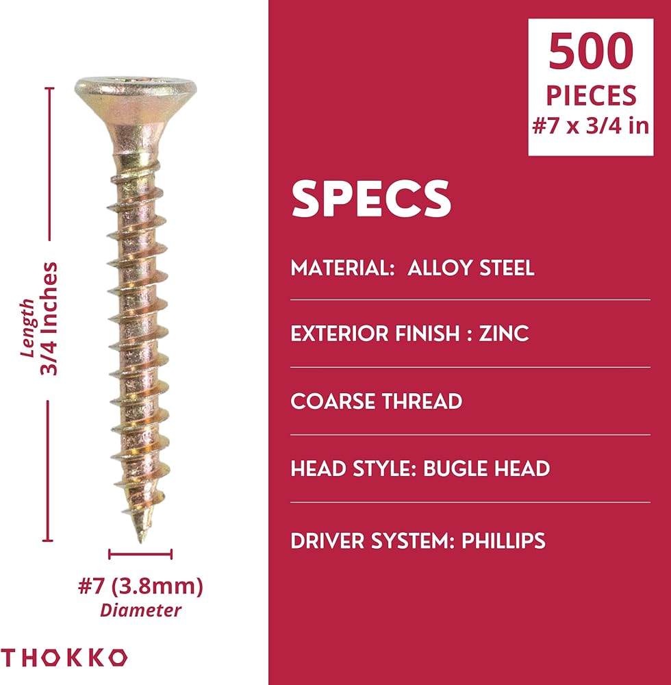 Thokko #7 x 2 in.(3.8 x 50mm) Countersunk Phillips-drive Bugle Head Wood/Drywall Screws (150pcs) Commercial-Grade Heavy Duty Countersunk Head Zinc-coated Steel Screws 150-PACK OF BRASS-COATED WOOD SCREWS This popular pack of a #7 x 2 in.(3.8 x 50mm) wood screws are the first choice of professional tradesmen and keen DIY enthusiasts alike who are looking for a reliable high quality and effective wood screw. COUNTERSUNK PHILIPS HEADS FOR EASY USE Featuring the preferred countersunk head design, these wooden screws are fast to grip and enter the wood at your chosen point and screw in quickly and securely, offering a superbly strong hold with all types of wood. MADE FROM COMMERCIAL GRADE STEEL Manufactured to the very highest standards using the latest machinery to ensure a premium top-grade zinc-coated steel screw that is strong, durable, long-lasting, and reliable. SUITABLE FOR A WIDE RANGE OF USES The quality of these 150pc wood screws makes them perfectly suited to a variety of applications, most commonly for securing small battens, plinths, frames, furniture, etc. and also for general woodworking and DIY projects. GREAT VALUE PACK OF POPULAR-SIZE #7 x 2 in.(3.8 x 50mm)) SCREWS Offering exceptional value for money and the very best quality, this 150 pack of #7 x 2 in.(3.8 x 50mm) wood screws are great for keeping handy in your tool box to have available and ready for your next project or job.