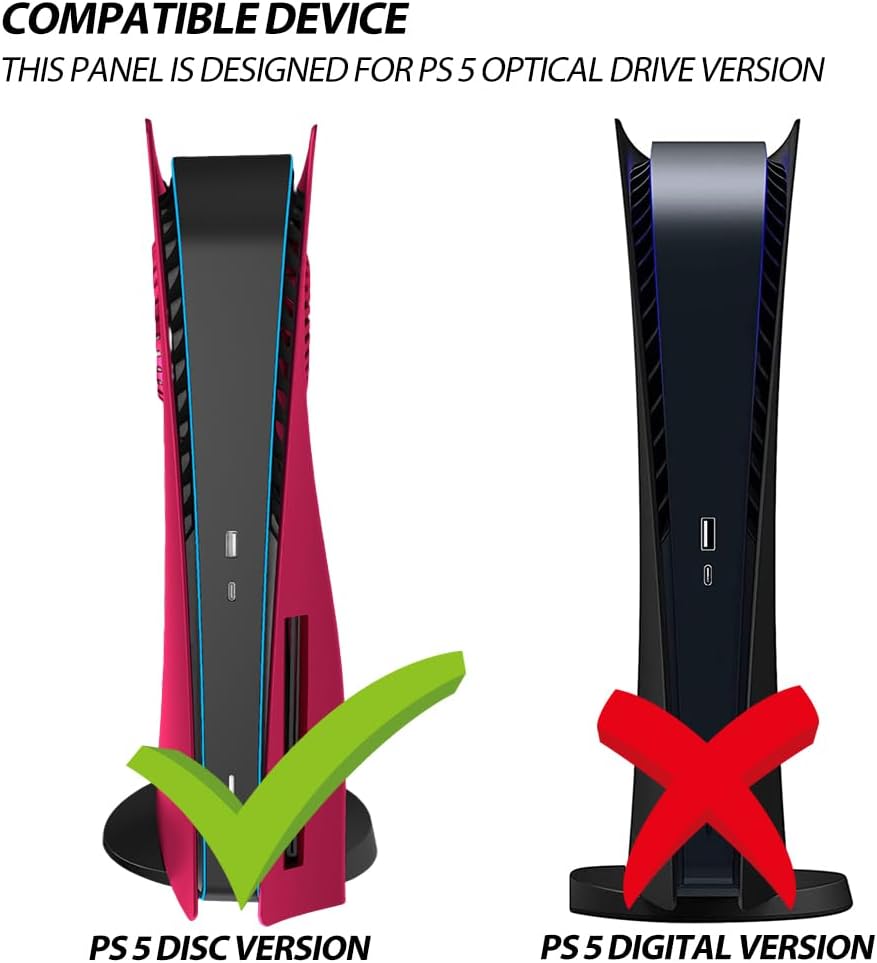 【Easy Installation】: Everyone can replace this PS5 faceplate quickly and easily: ①Lift under the rear corner of the protective cover where the PS5 logo is located, release the circular buckle. ②Push the cover down toward the bottom of the console, the cover will slide off. ③To install new plate, line of up the plate to the console vertically, hold the top of the console and push the plate up to lock in the plate.