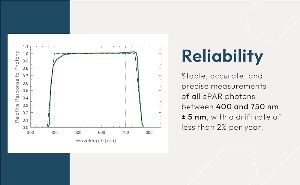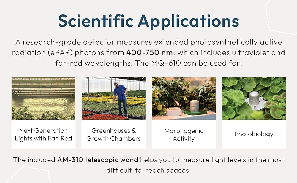 NEW ePAR RANGE: Lab-grade measurement reveals photosynthetic activity from 400-750 nm, expanding beyond the traditional 400-700 nm PAR range. Dr. Shuyang Zhen and Dr. Bruce Bugbee spearheaded the defining research. The MQ-610 accurately measures far-red photons (700-750 nm), vital for next-gen LED fixtures, sunlight, and other sources not captured by standard PAR meters.