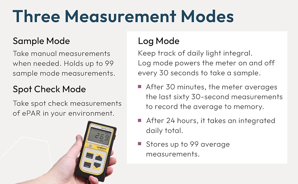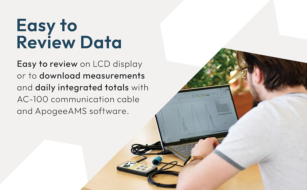 FEATURES - Highly accurate and reliable, the MQ-610 is the choice of scientists and dedicated growers for precise PAR measurements. Its rugged design features a machined aluminum sensor head, fully potted for waterproofing and durability. The tangle-free cable enables easy measurements across large plant canopies, all while maintaining visibility of the high-contrast display screen.