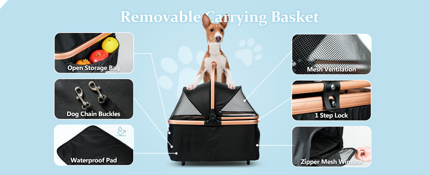 🌬️ Breezy Bliss & Fortified Security 🔒: Our pet stroller is made with a light, airy fabric that keeps your pet comfy and dry, thanks to its waterproof mat. Mesh windows offer great views and a bug-free breeze, making sure your pet has fun watching the world go by. This pet gear stroller is safe too, with locks that keep everything secure. The canopy can move all around, so your pet can look out or get some shade, perfect for curious cats and small dogs.