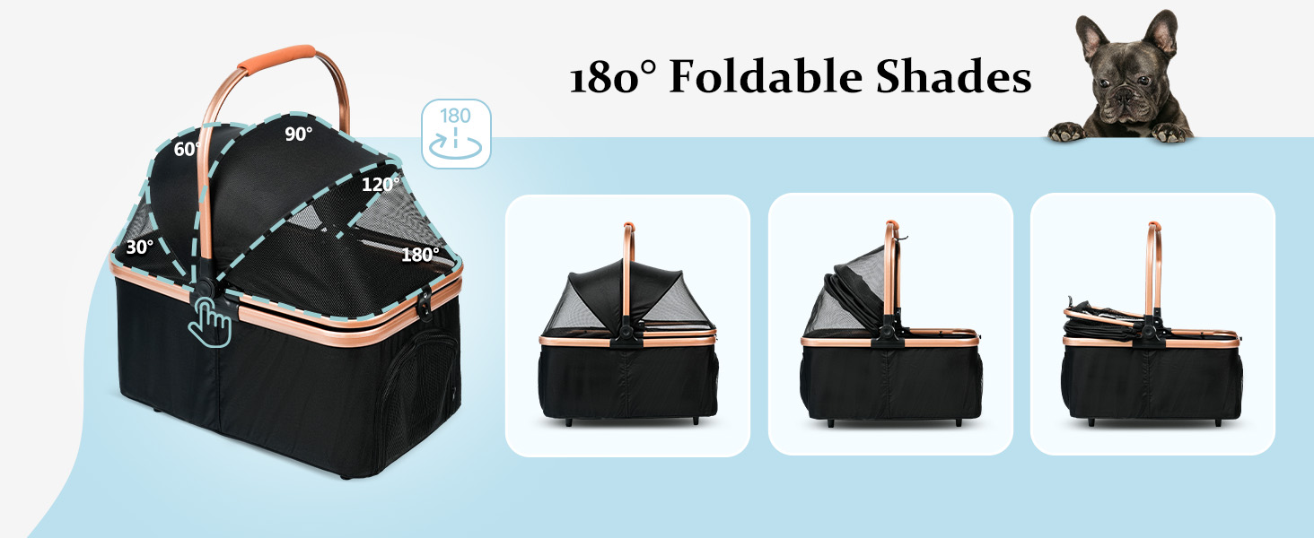 🎒 Spacious Storage 🌈: Our pet stroller brings convenience, featuring a handy cup holder on the handlebar for your drinks and easy access to essentials. The spacious storage compartment is ideal for storing toys, treats, and necessities, ensuring a peaceful and prepared excursion. The 180° adjustable canopy provides various views for your pet's curiosity, opening up fully or partially to the world.