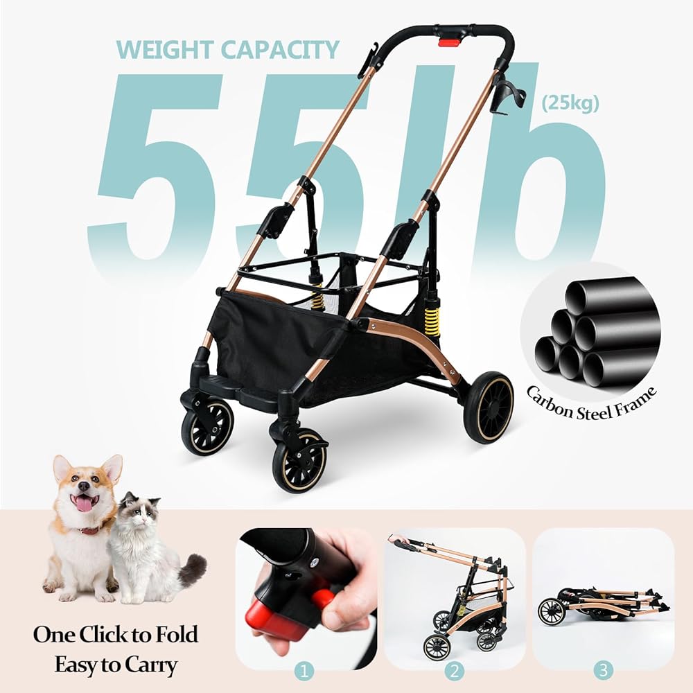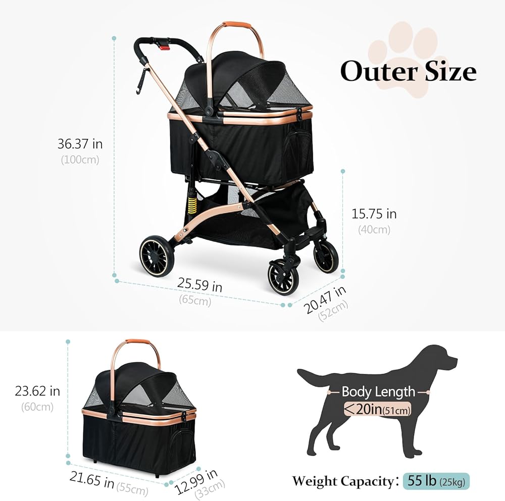 👌 Ultimate Convenience at Your Fingertips 🎒: Our pet stroller is a blessing for pet parents on the go, with its compact, easy-fold design. A one-touch fold mechanism that transforms it into a compact form effortlessly. It boasts generous dimensions (Open: W 20.47 x D 25.59 x H 38.58 inches; Folded: 33.07 x 22.44 x 7.48 inches) plus a robust maximum weight capacity of up to 55 lbs (25 kg), ensures your pet strolls in comfort and style