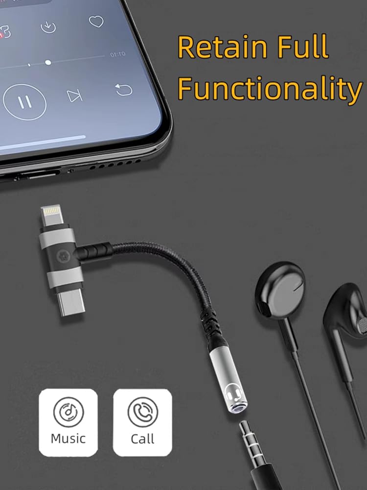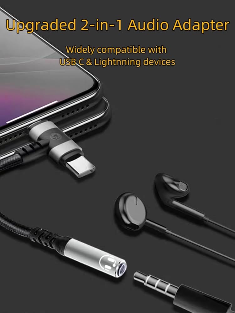 ✨【2-in-1 audio and charging adapter】USB C and lighting to 3.5mm headphone jack adapter, 2-in-1 audio adapter cable, solves the problem of requiring 2 adapters for phones with 2 different ports.