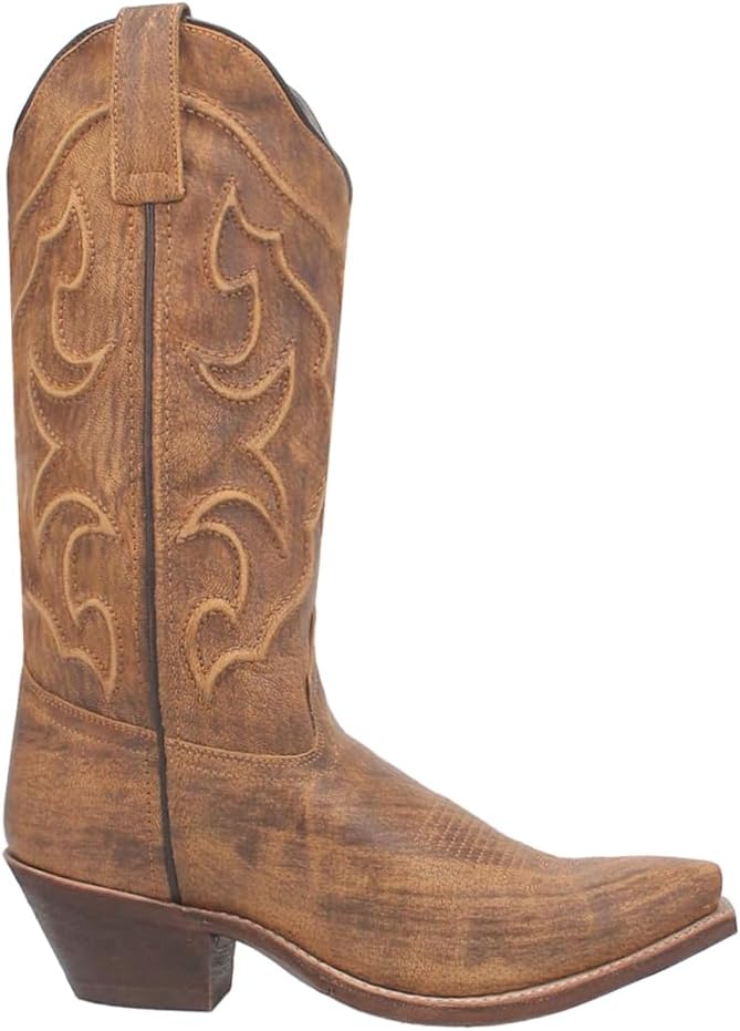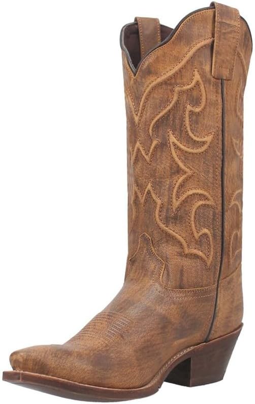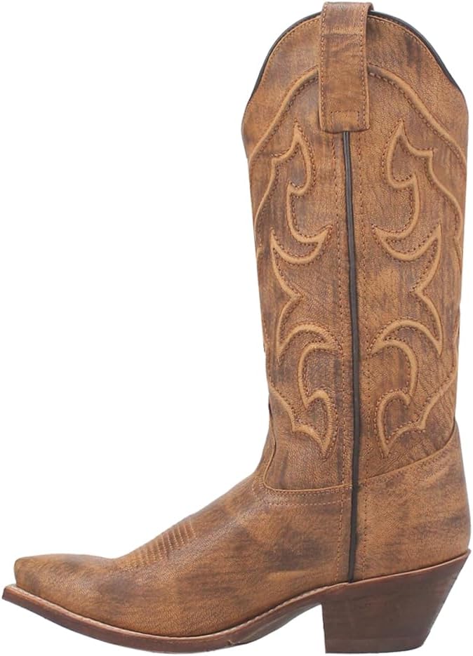 Strut with confidence in the Reva boot from Laredo. Meticulously crafted with weathered-look leather and bold stitching. This 12-inch cowgirl boot ensures all-day comfort with its cushioned insole, snip toe, flexible rubber outsole, and medium cowboy heel.