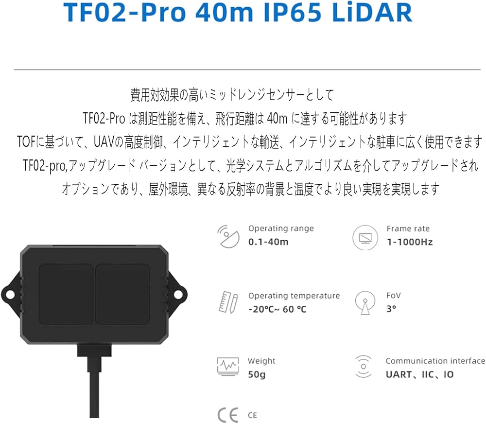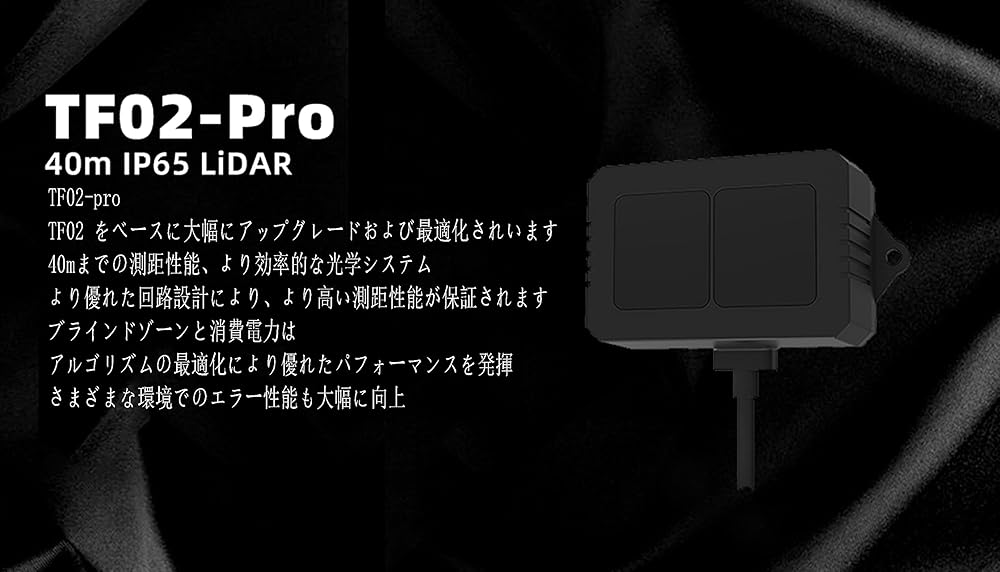 The TF02-Pro is a TOF single-point solid state LIDAR. The TF02-Pro has been significantly upgraded and optimized from the TF02 to achieve a range of up to 40 m. The more efficient optical system and better circuit design ensure higher range performance. It can be widely used in fields such as UAV altitude holding, intelligent transportation, intelligent parking, intelligent agriculture, etc.