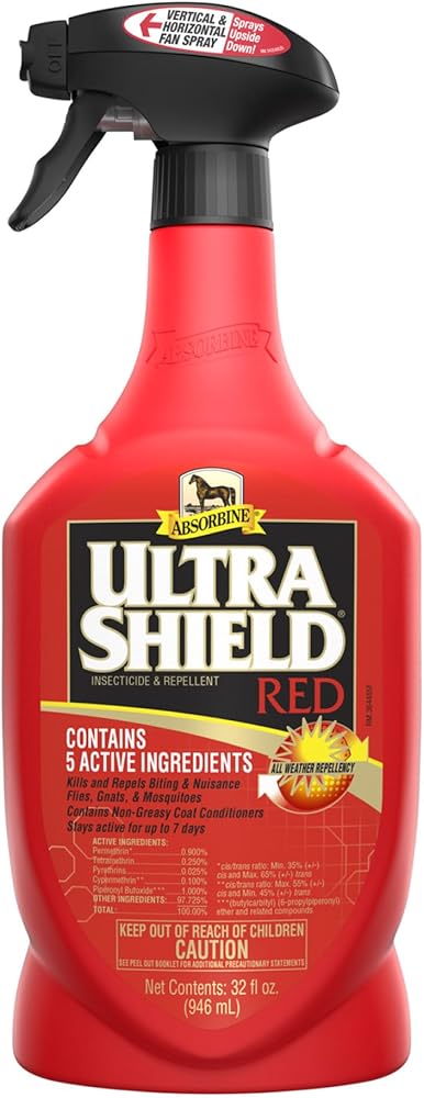 Absorbine UltraShield Red Fly Spray, Insecticide and Repellent for Horses & Livestock, Stays Active Up to 7 Days, 32oz Quart Spray Bottle