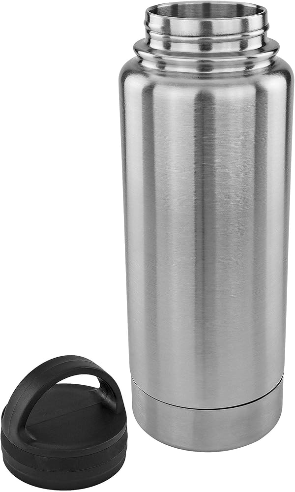 Southern Homewares brand Stainless Steel Stash Bottle in Pure (Silver) Color is perfect for keeping valuables out of plain sight. The main body of the bottle functions normally with your beverage of choice while simultaneously incorporating a separate compartment that can store small valuables. Store a USB drive, money, keys, ID's, watches, or anything valuable to you while using it as a normal bottle! Perfect for taking with you when attending events, parties, out on the beach, and anywhere else imaginable! Nobody will ever think to look twice at this dual-purpose bottle. Vacuum sealed double-walled construction means your hot drinks stay hot and your cold drinks stay cold. Bottle contains a black screw-on lid with a convenient built in handle. Drinking container part holds 12 US fluid ounces. Volume of the stash compartment is 24.25 cubic inches. The opening is 2.80 inches in diameter and the height is 3.94 inches. Hand wash only. Color is Silver. Overall item dimensions are 3.29" x 3.29" x 10.38"